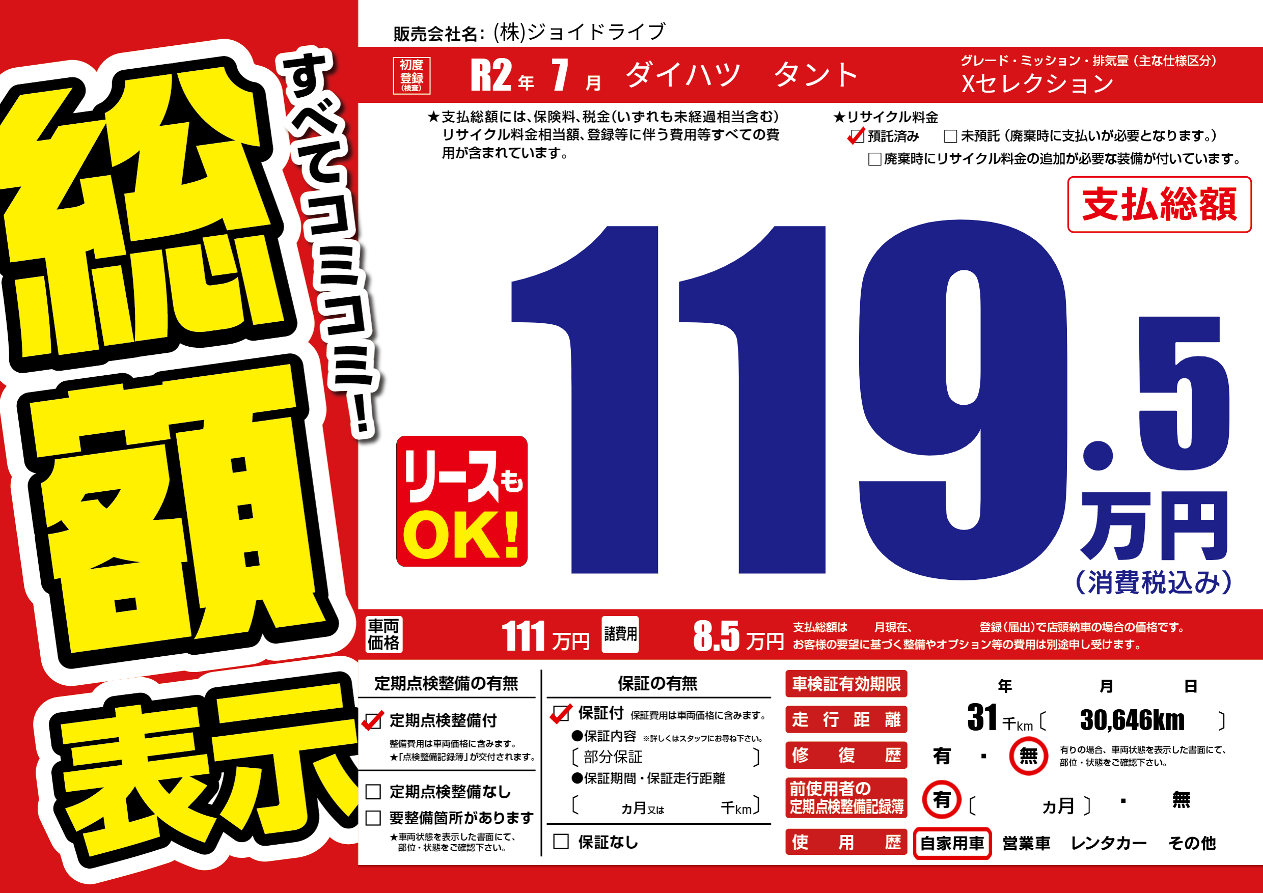 保証付き 保証内容(部分保証) ---ヶ月または()千kmまで |