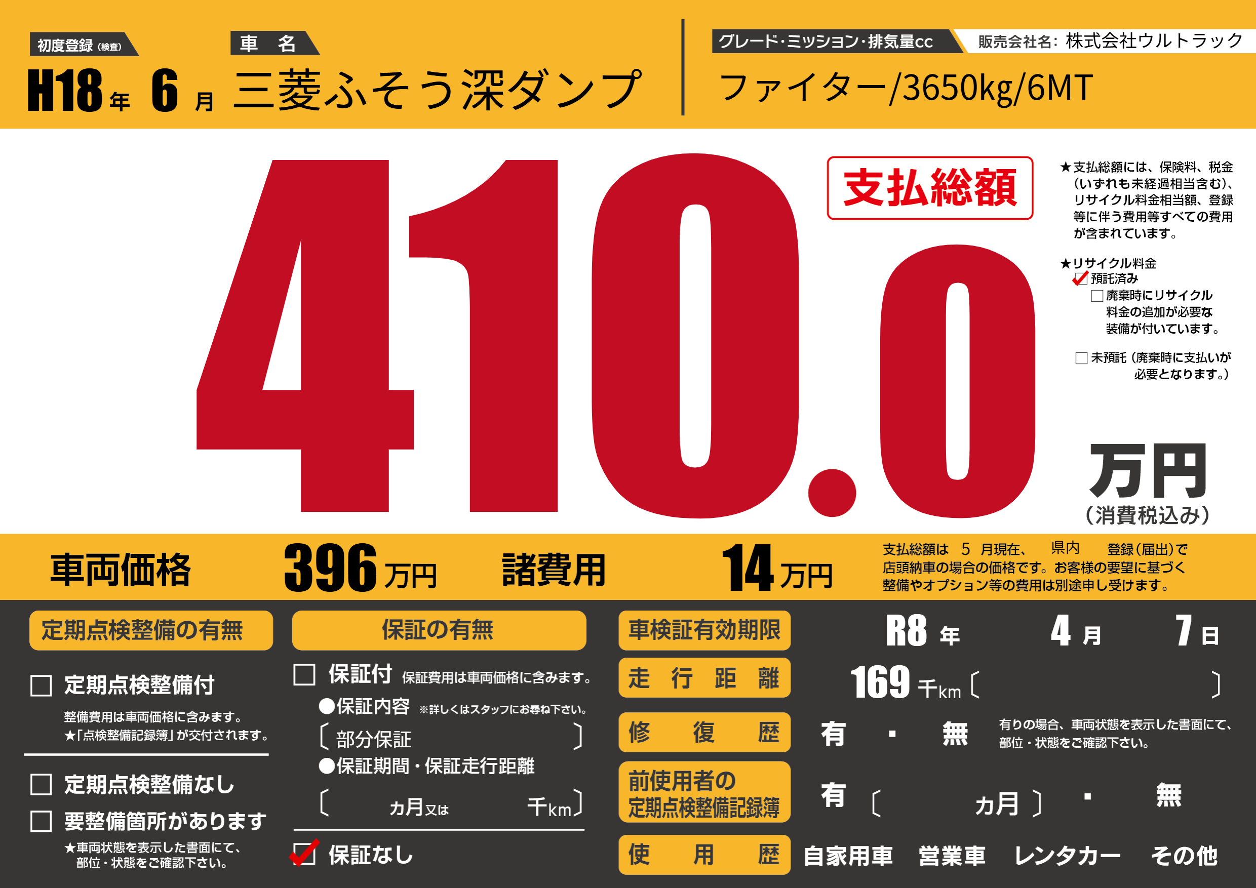 | 車名 | 三菱ふそう深ダンプ | グレード ミッション 排気量 |