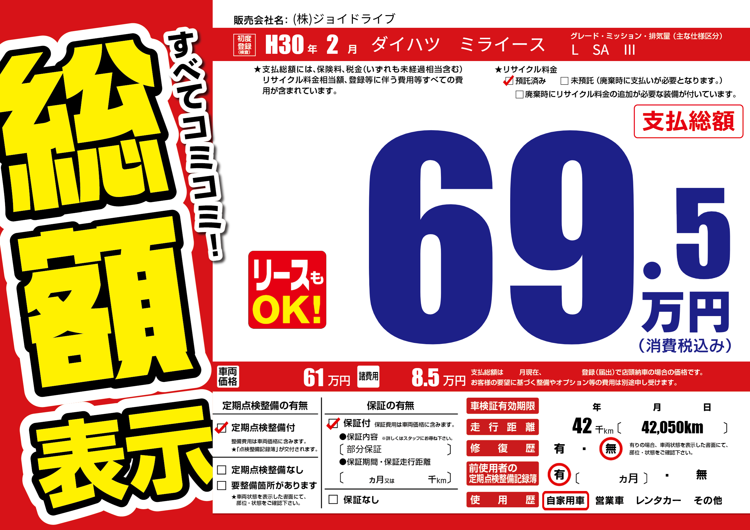 | 車名 | ダイハツ ミライース | グレード ミッション 排気量 |