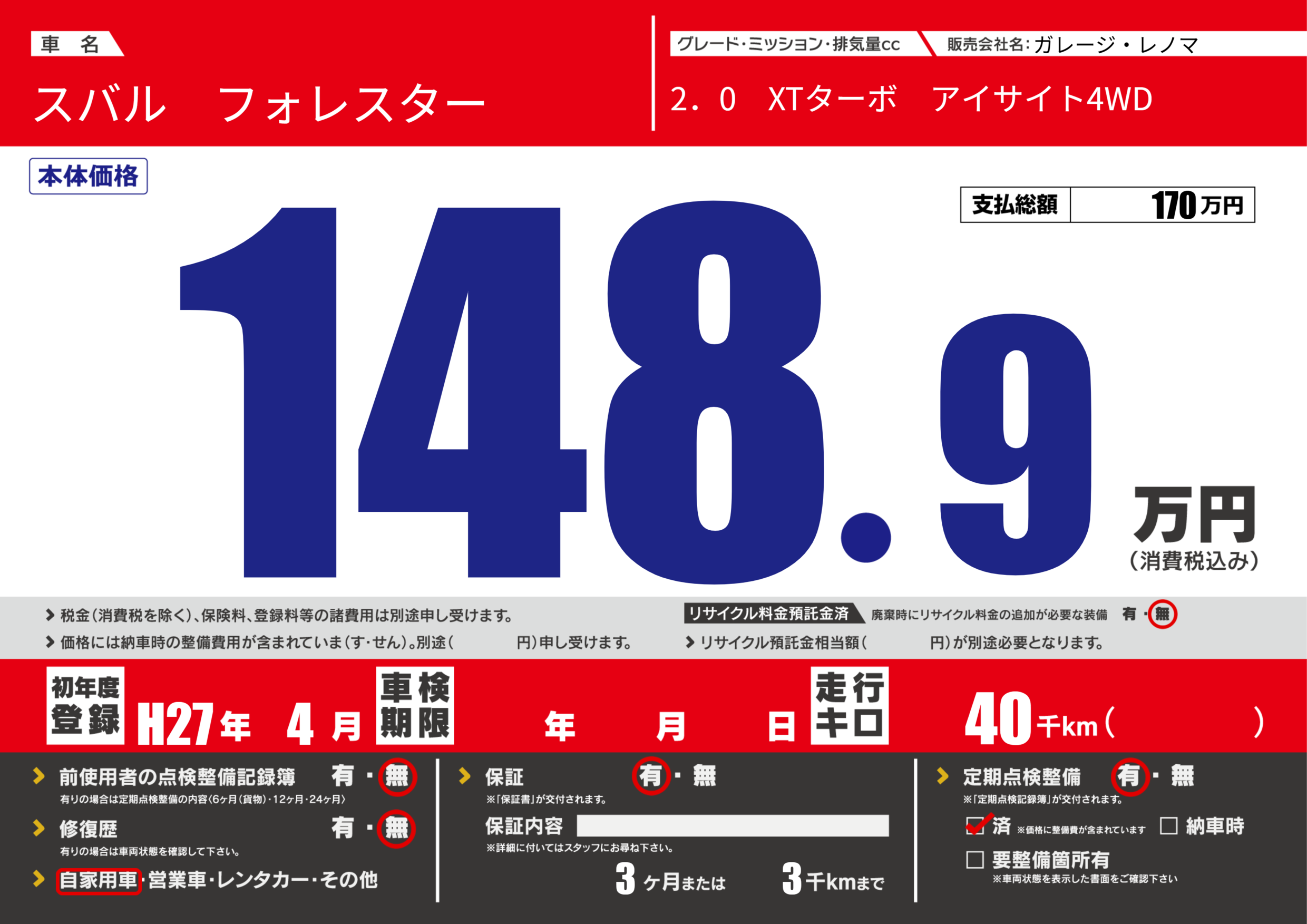 | 定期点検整備 | 定期点検整備あり 定期点検整備済み | ||