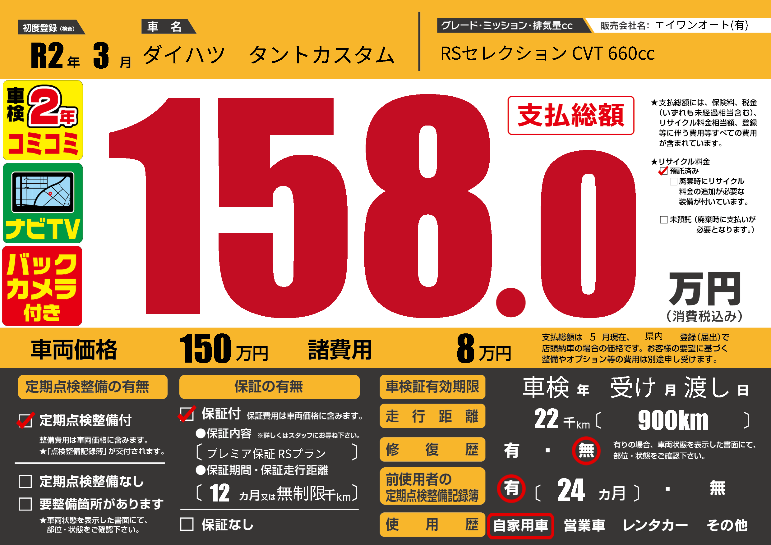 | 車名 | ダイハツ タントカスタム | グレード ミッション 排気量 |