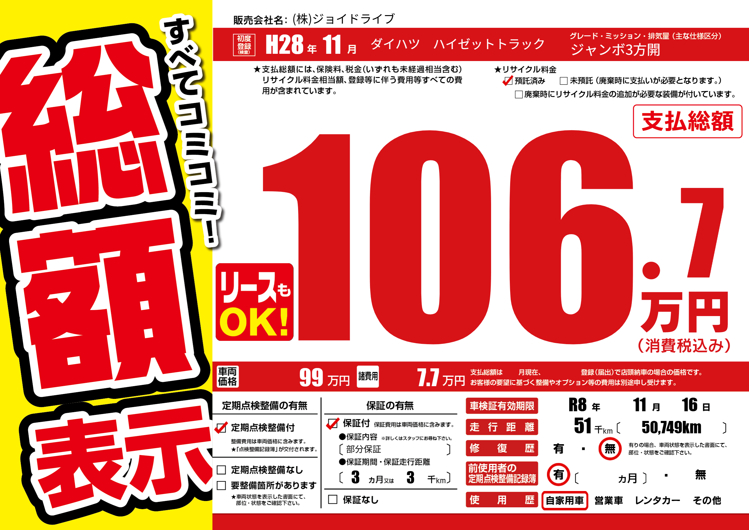| 走行キロ | 5.1万km | 初年度登録 | H28年11月 |
