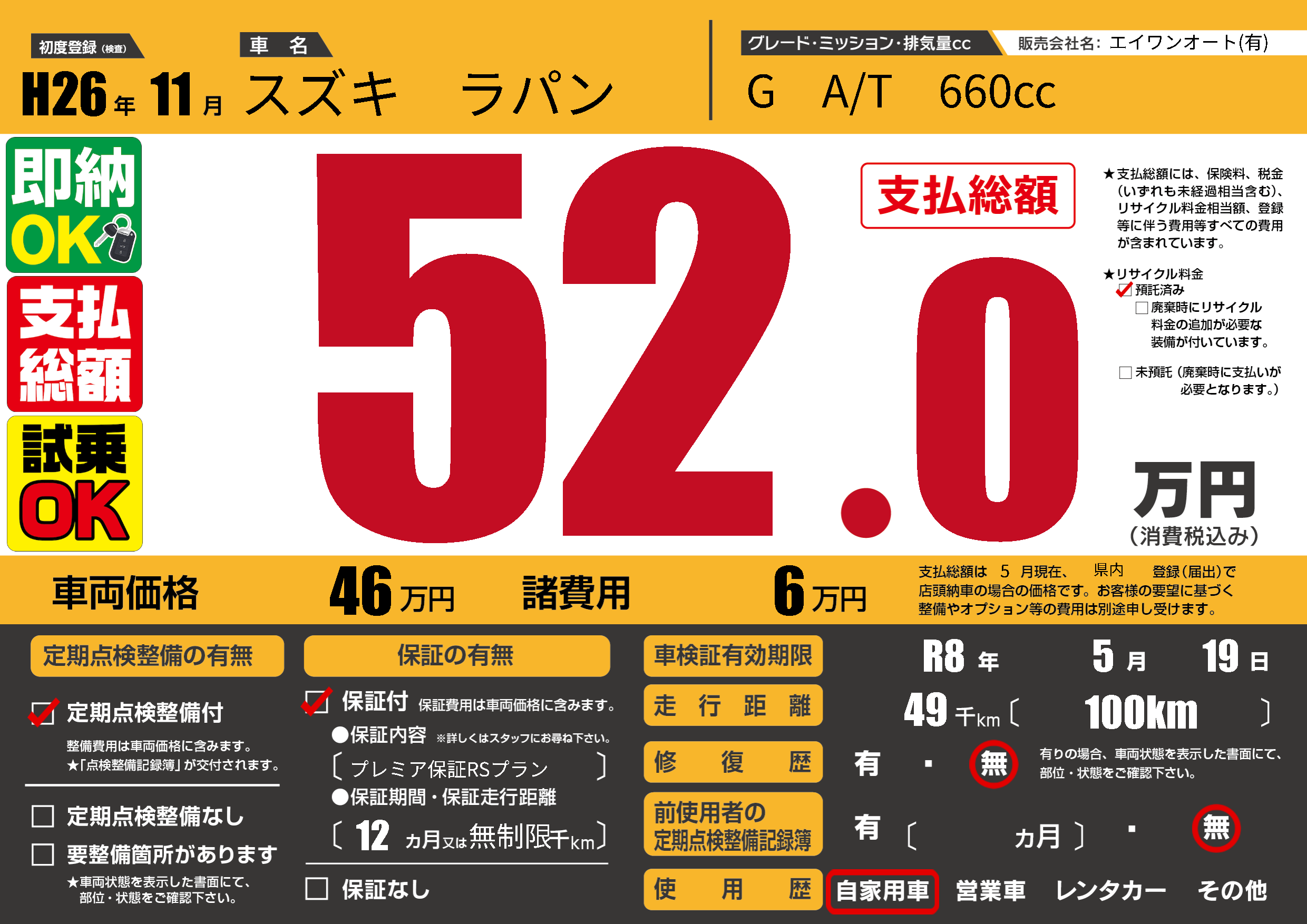 | 走行キロ | 4.9万km | 初年度登録 | H26年11月 |