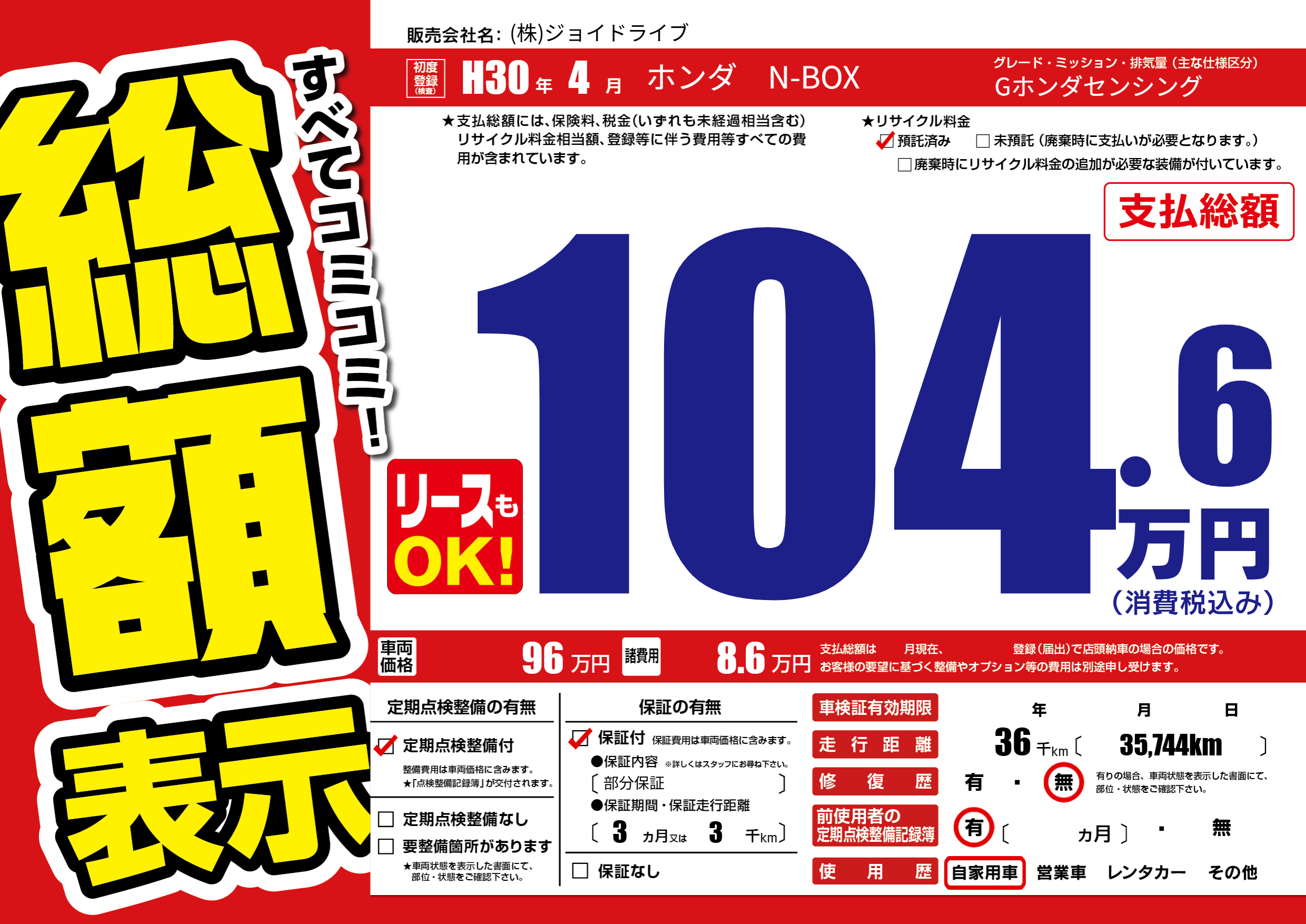 保証付き 保証内容(部分保証) 3ヶ月または(3)千kmまで |