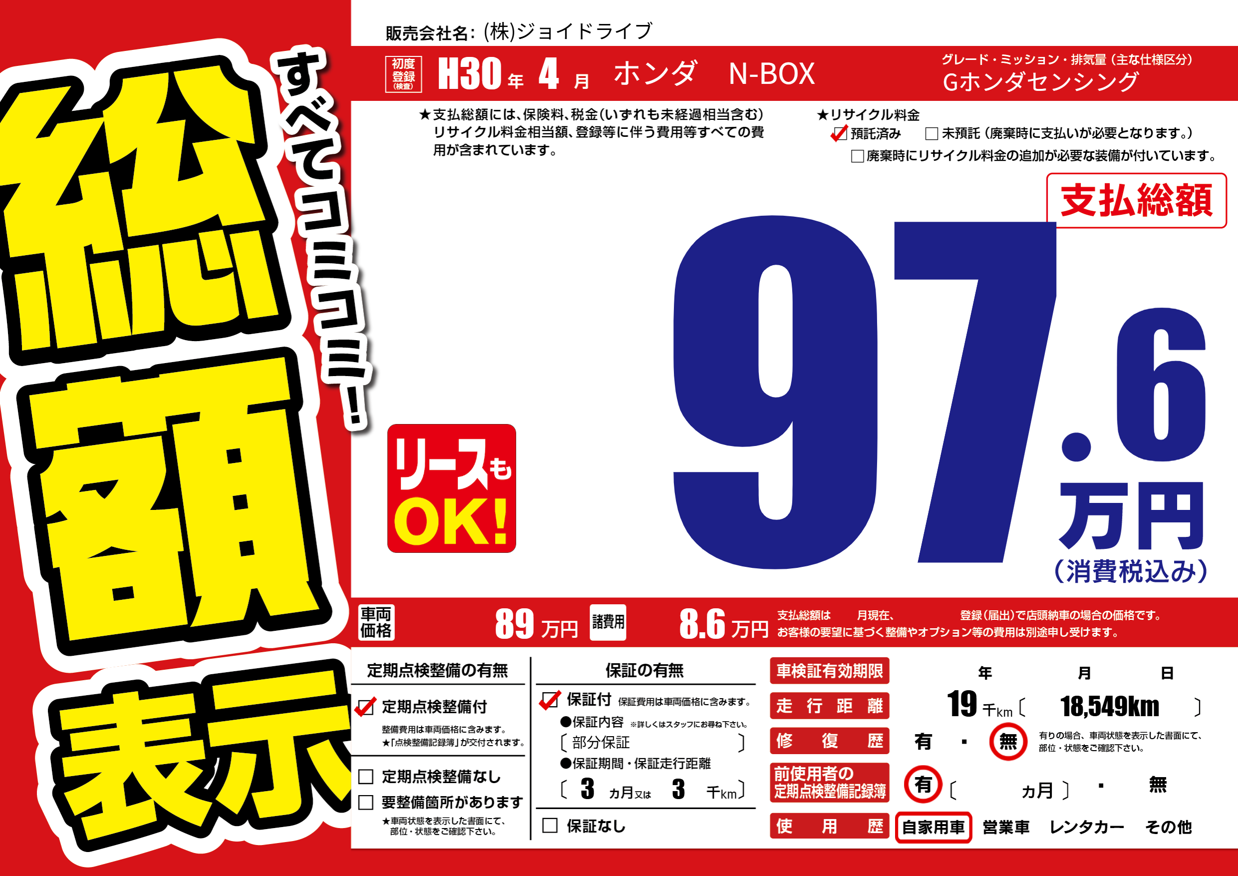 | 走行キロ | 1.9万km | 初年度登録 | H30年4月 |
