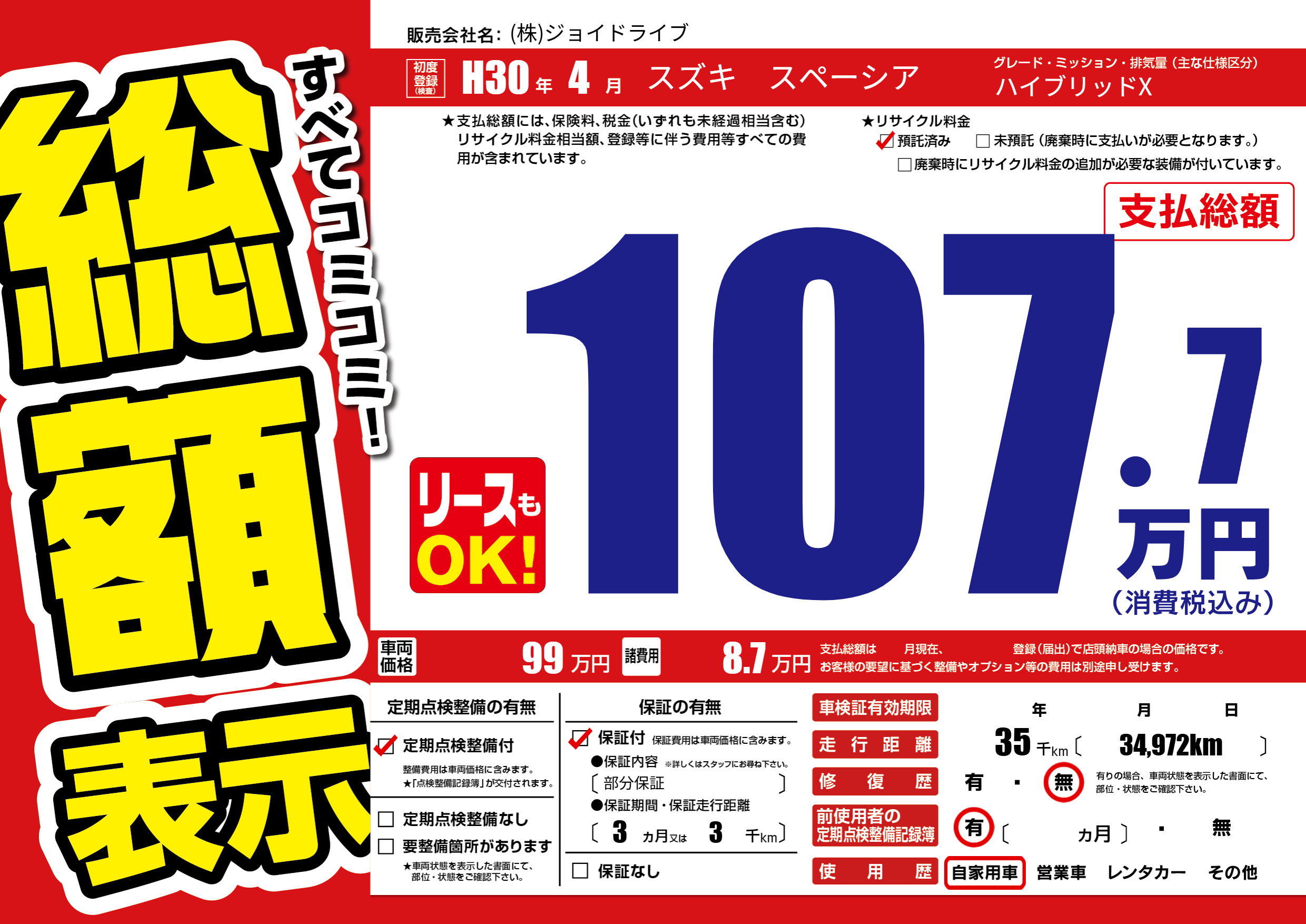 保証付き 保証内容(部分保証) 3ヶ月または(3)千kmまで |