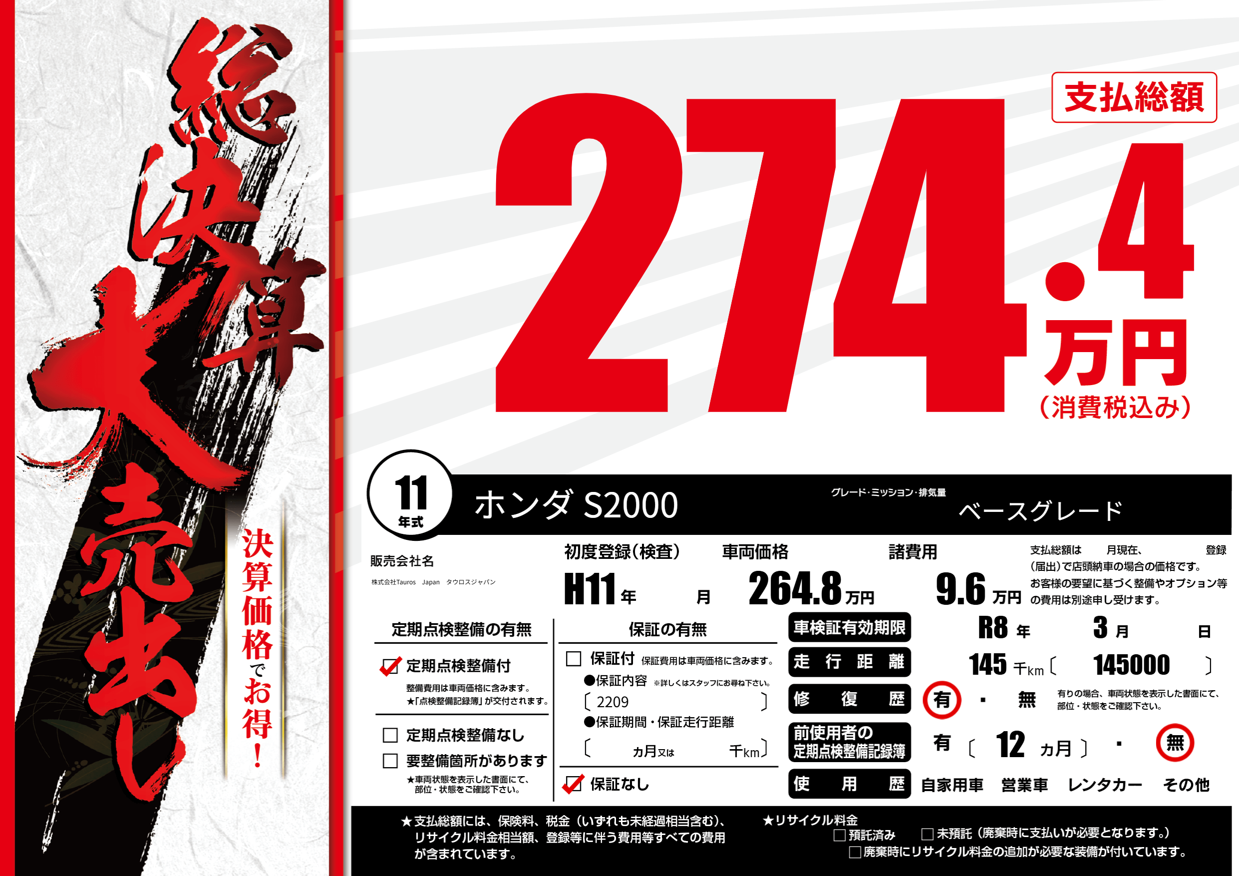 | 車名 | ホンダ S2000 | グレード ミッション 排気量 |