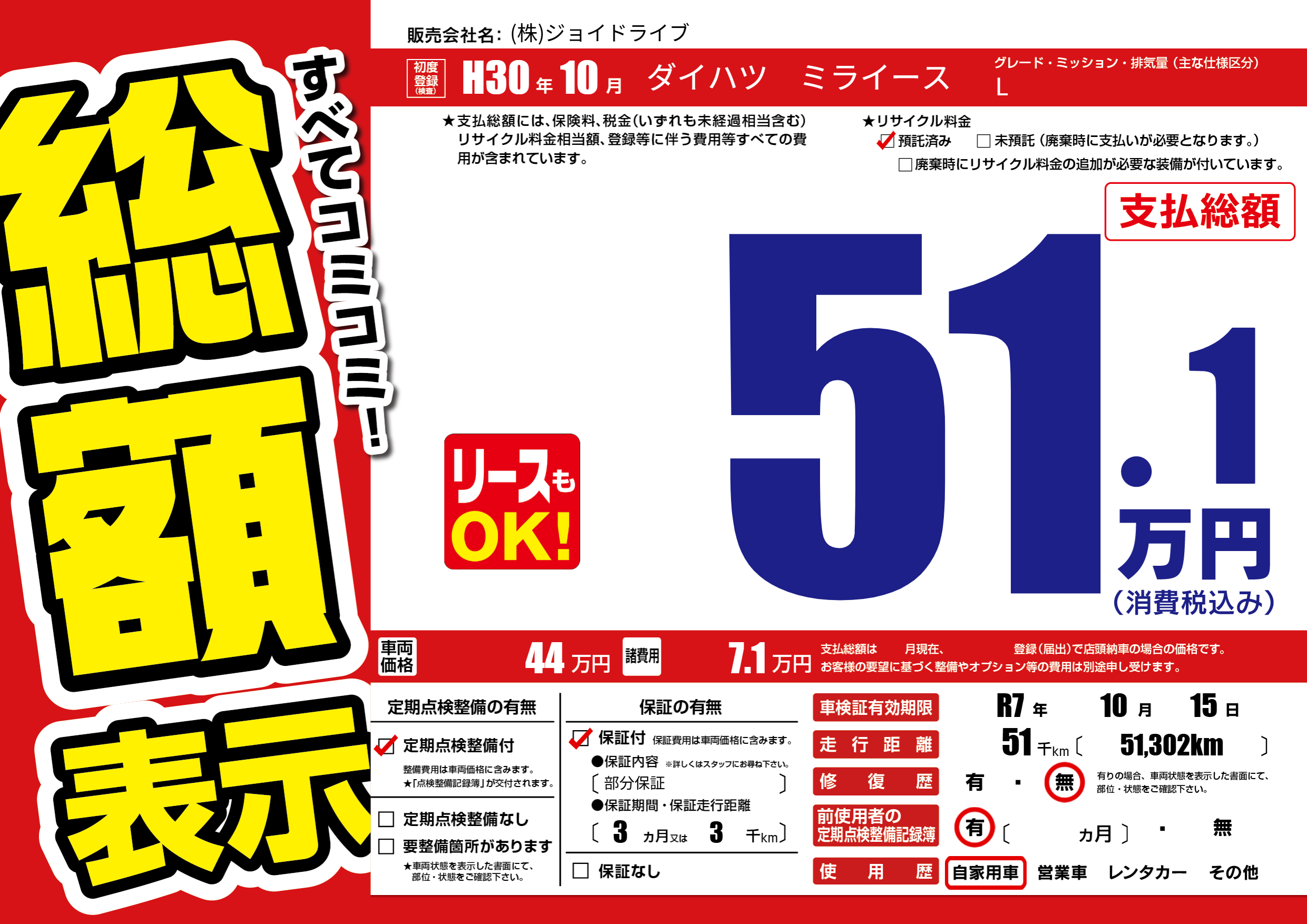 | 走行キロ | 5.1万km | 初年度登録 | H30年10月 |