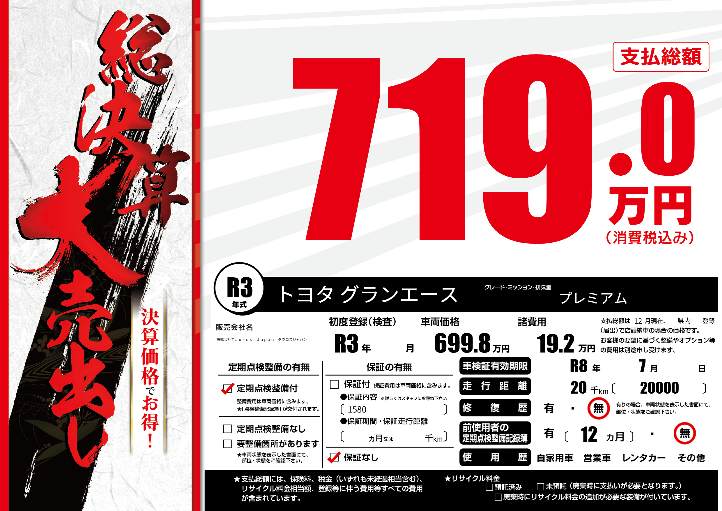 | 車名 | トヨタ グランエース | グレード ミッション 排気量 |