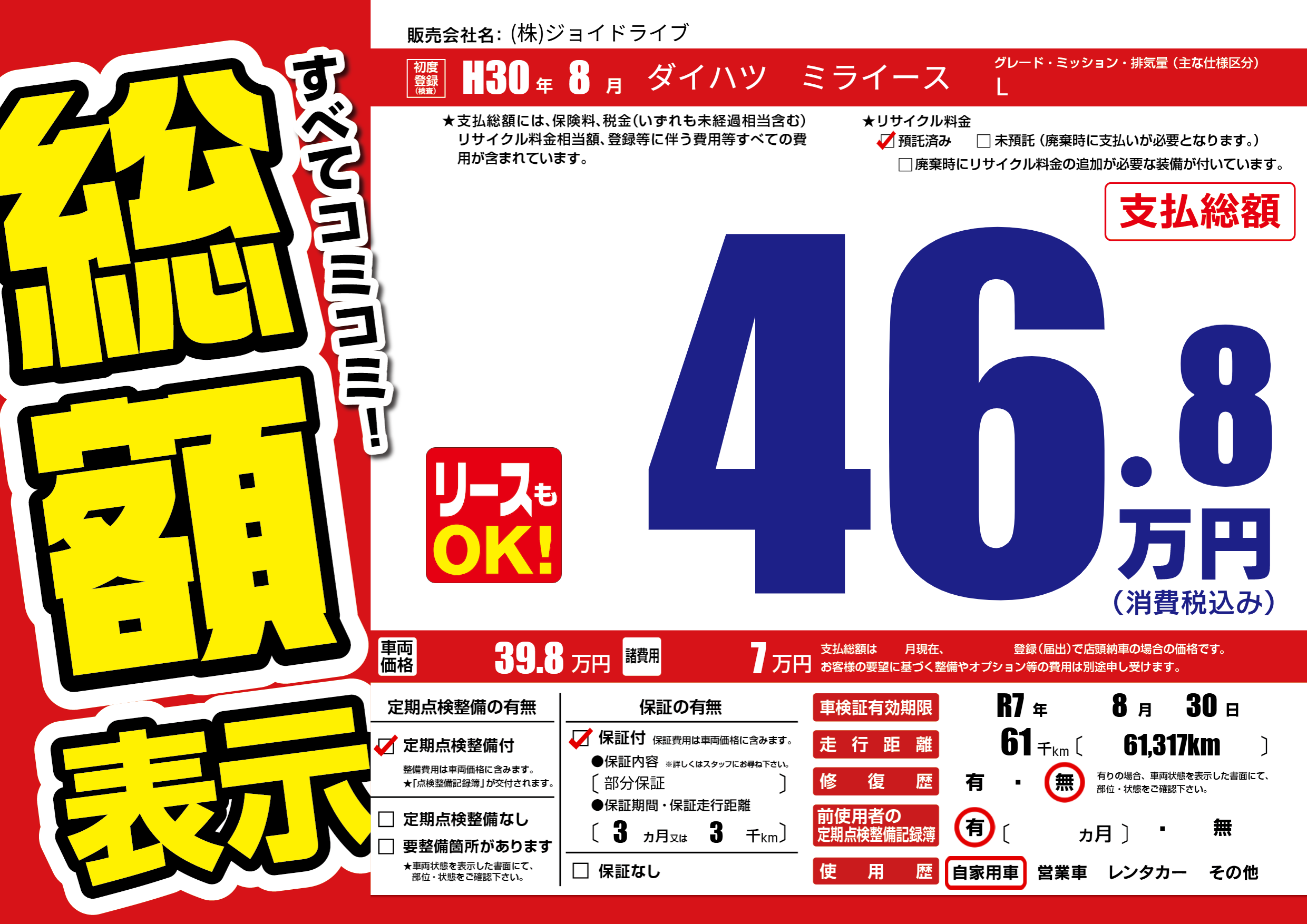 なし | 車検制限 | R7年8月30月 |