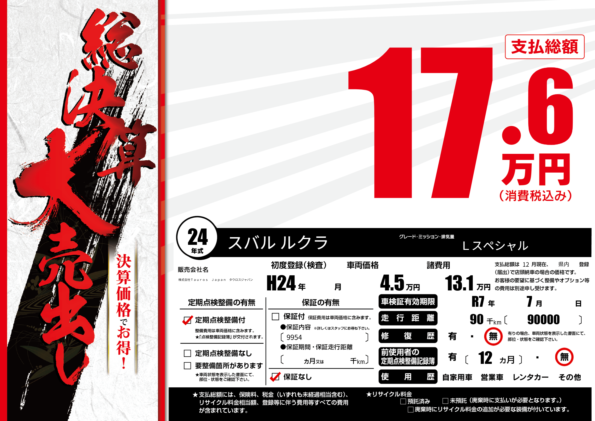| 車名 | スバル ルクラ | グレード ミッション 排気量 |