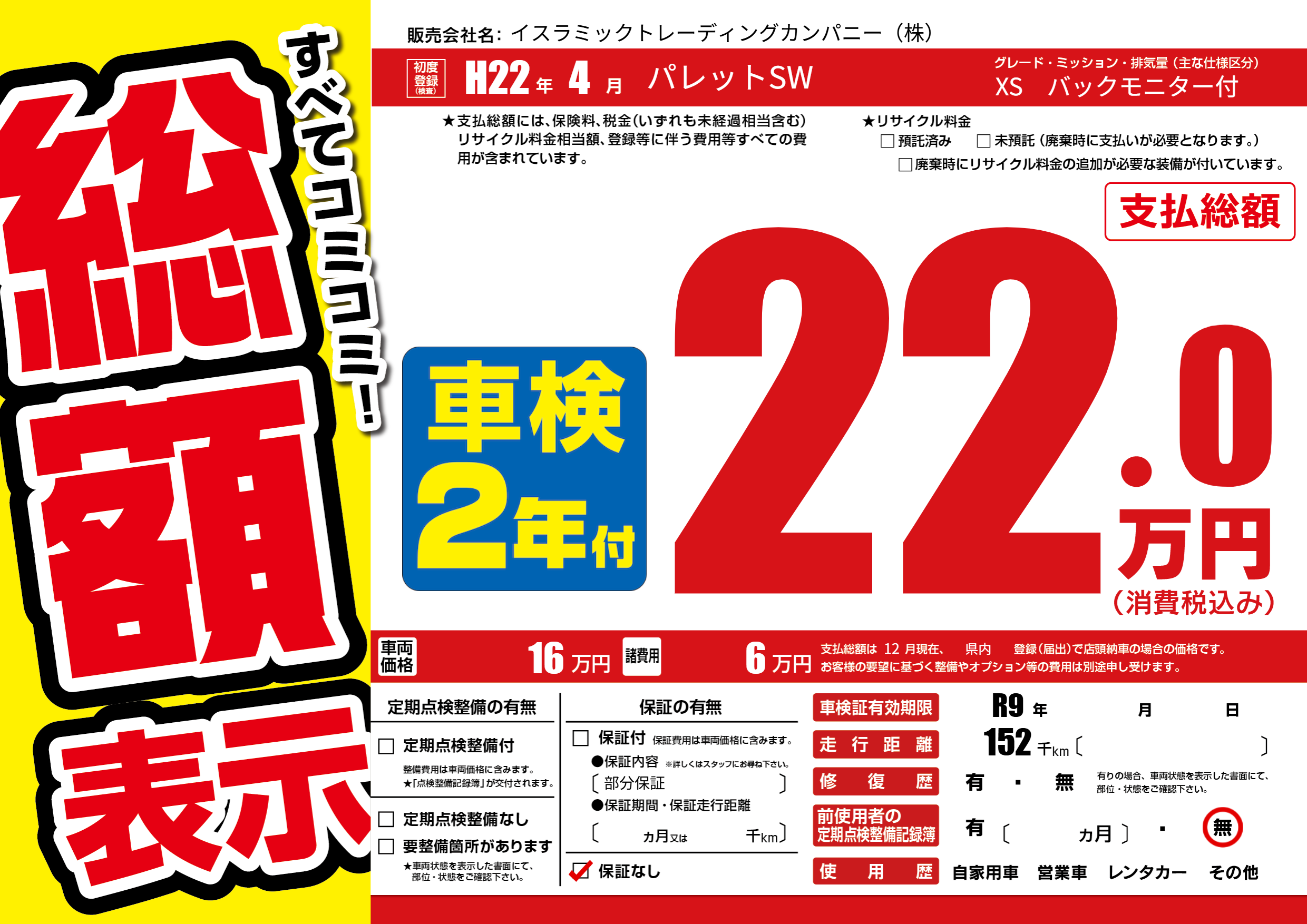 | 走行キロ | 15.2万km | 初年度登録 | H22年4月 |