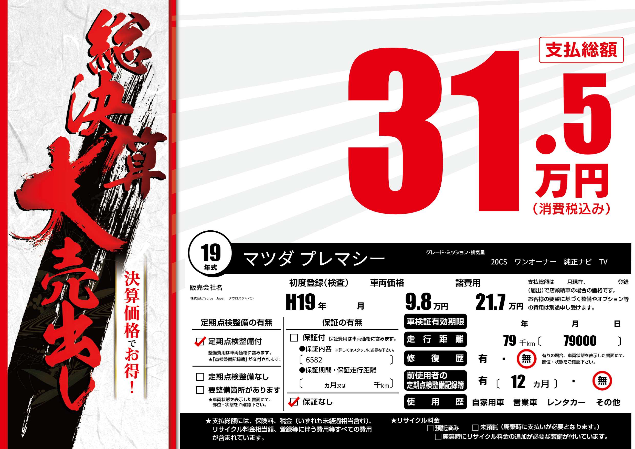 | 車名 | マツダ プレマシー | グレード ミッション 排気量 |