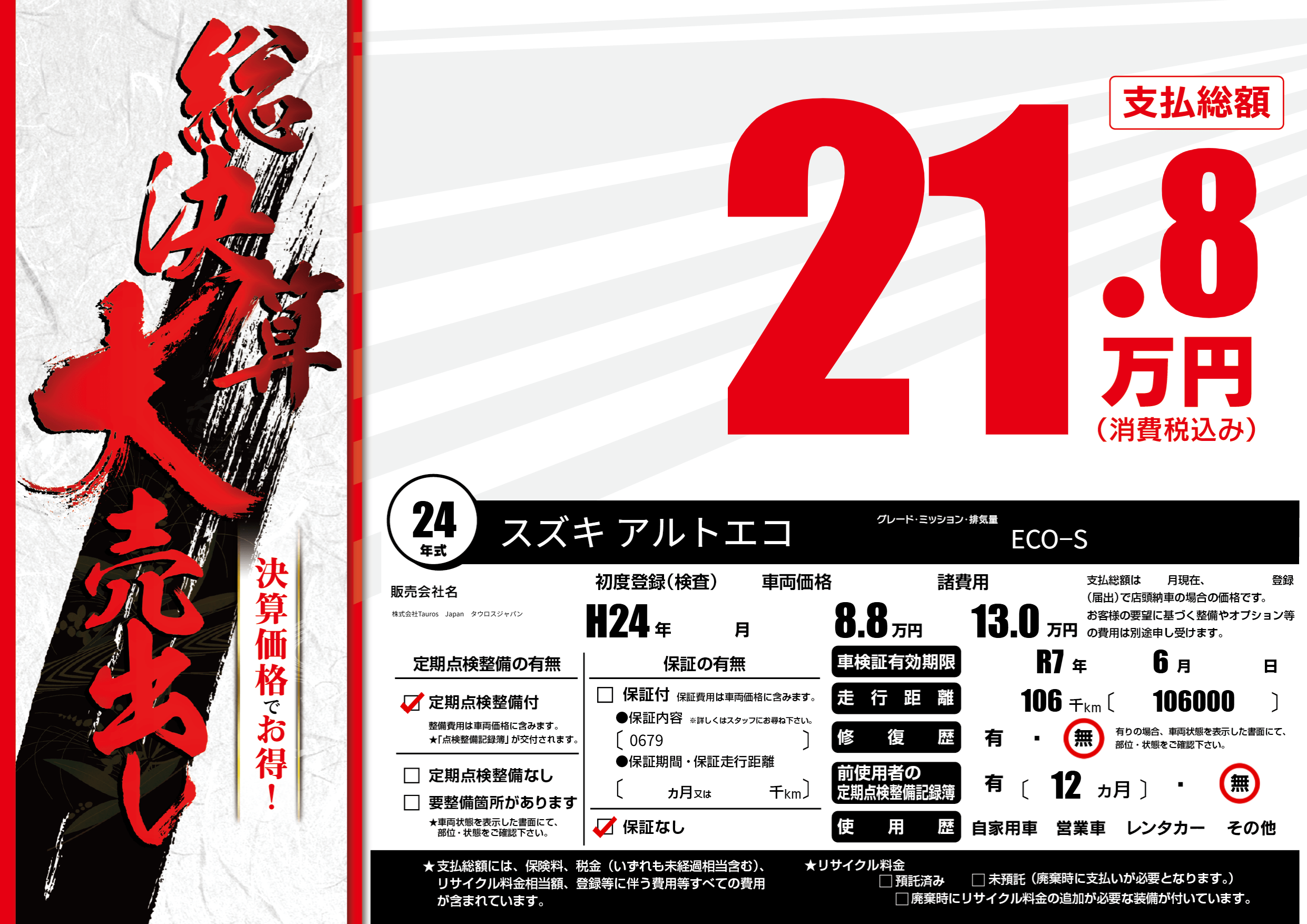 なし | 車検制限 | R7年6月---月 |