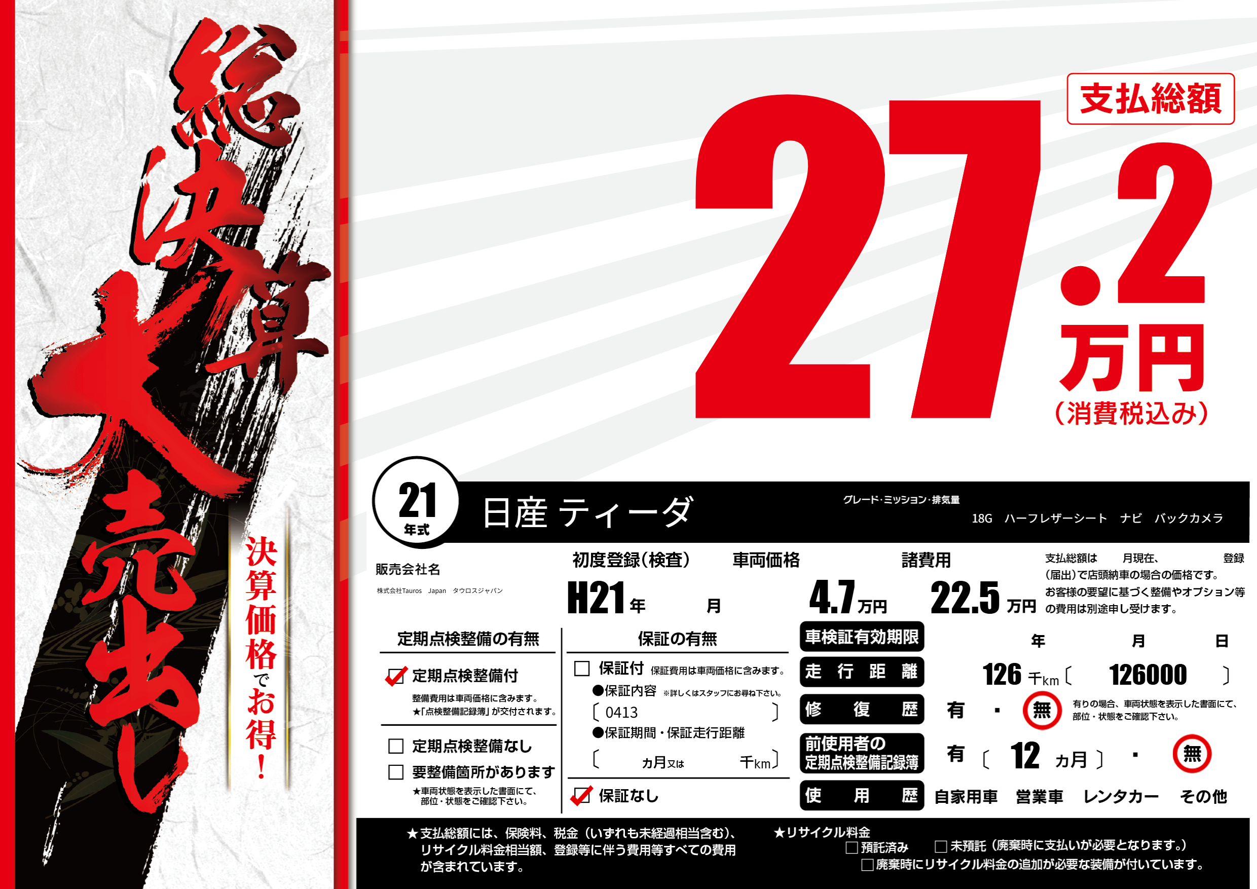 | 走行キロ | 12.6万km | 初年度登録 | H21年---月 |