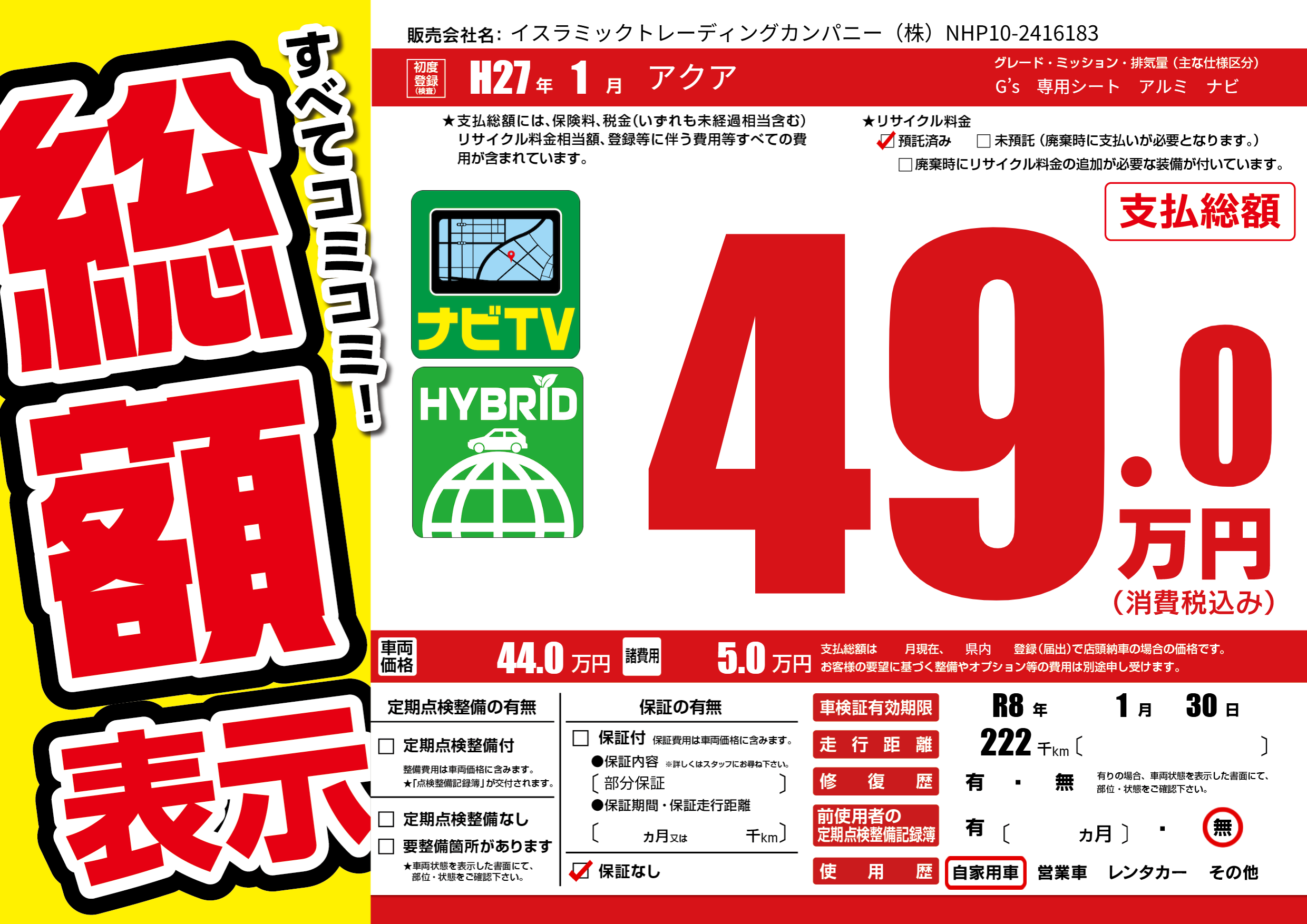 | 走行キロ | 22.2万km | 初年度登録 | H27年1月 |