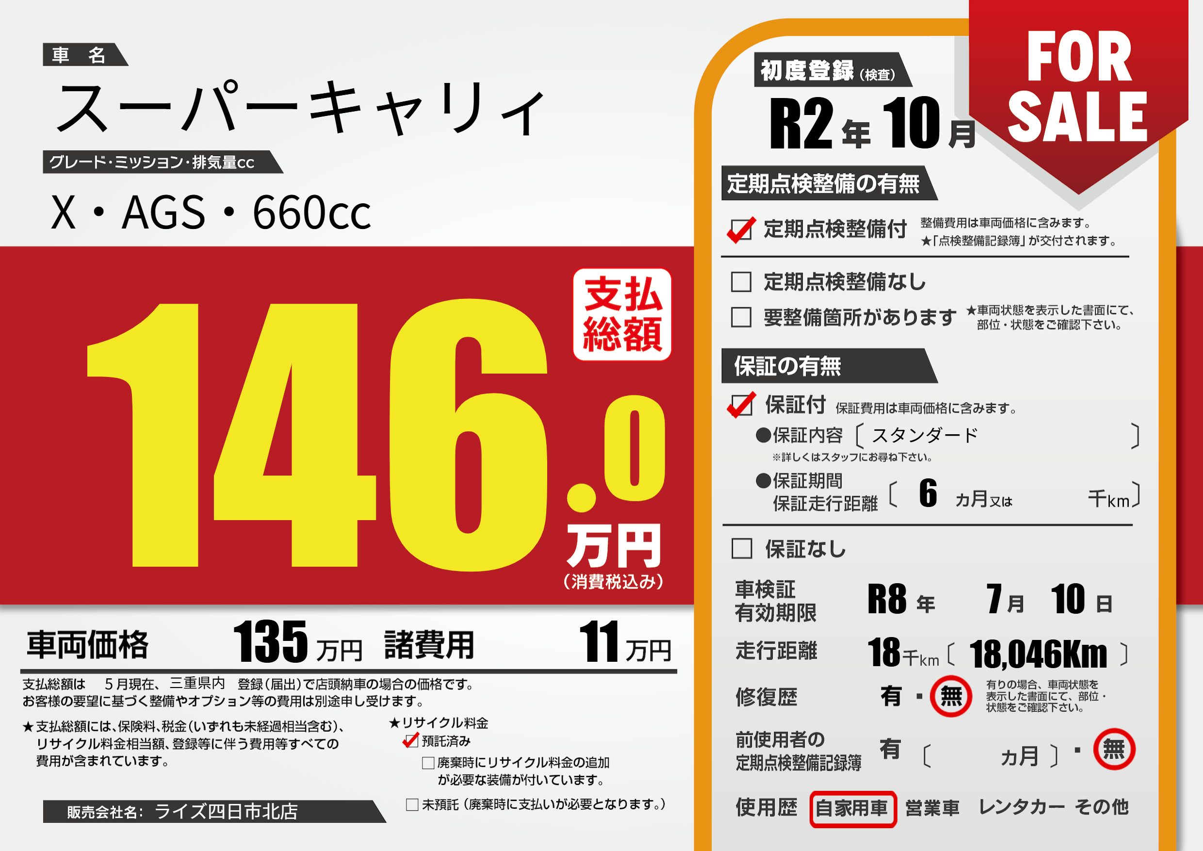 | 走行キロ | 1.8万km | 初年度登録 | R2年10月 |