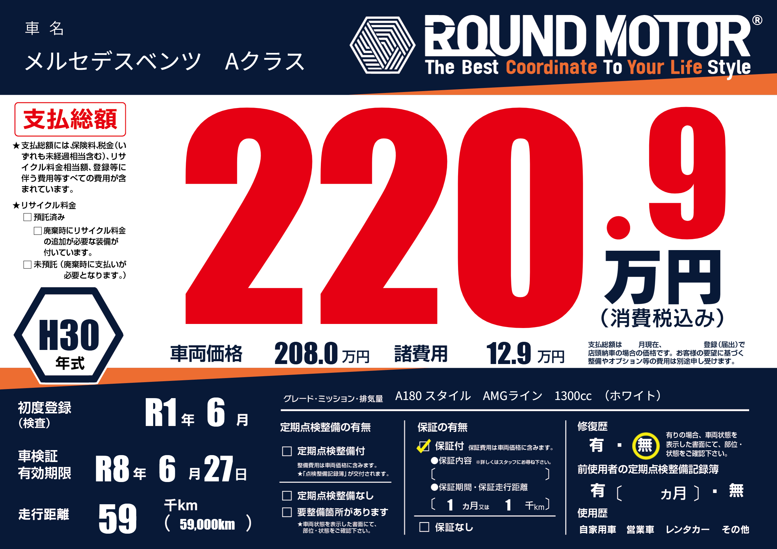 | 車名 | メルセデスベンツ Aクラス | グレード ミッション 排気量 |