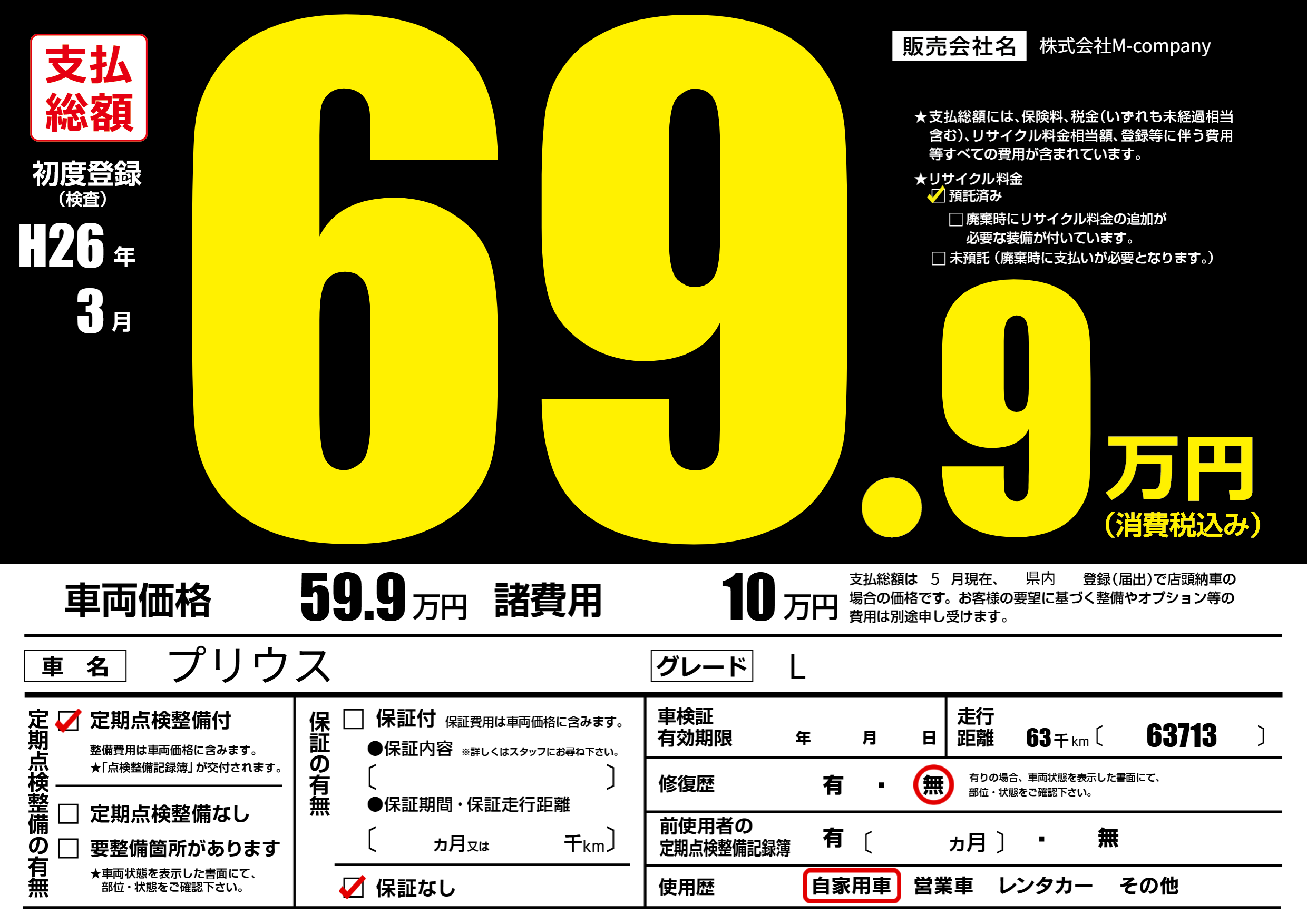 | 車名 | プリウス | グレード ミッション 排気量 |