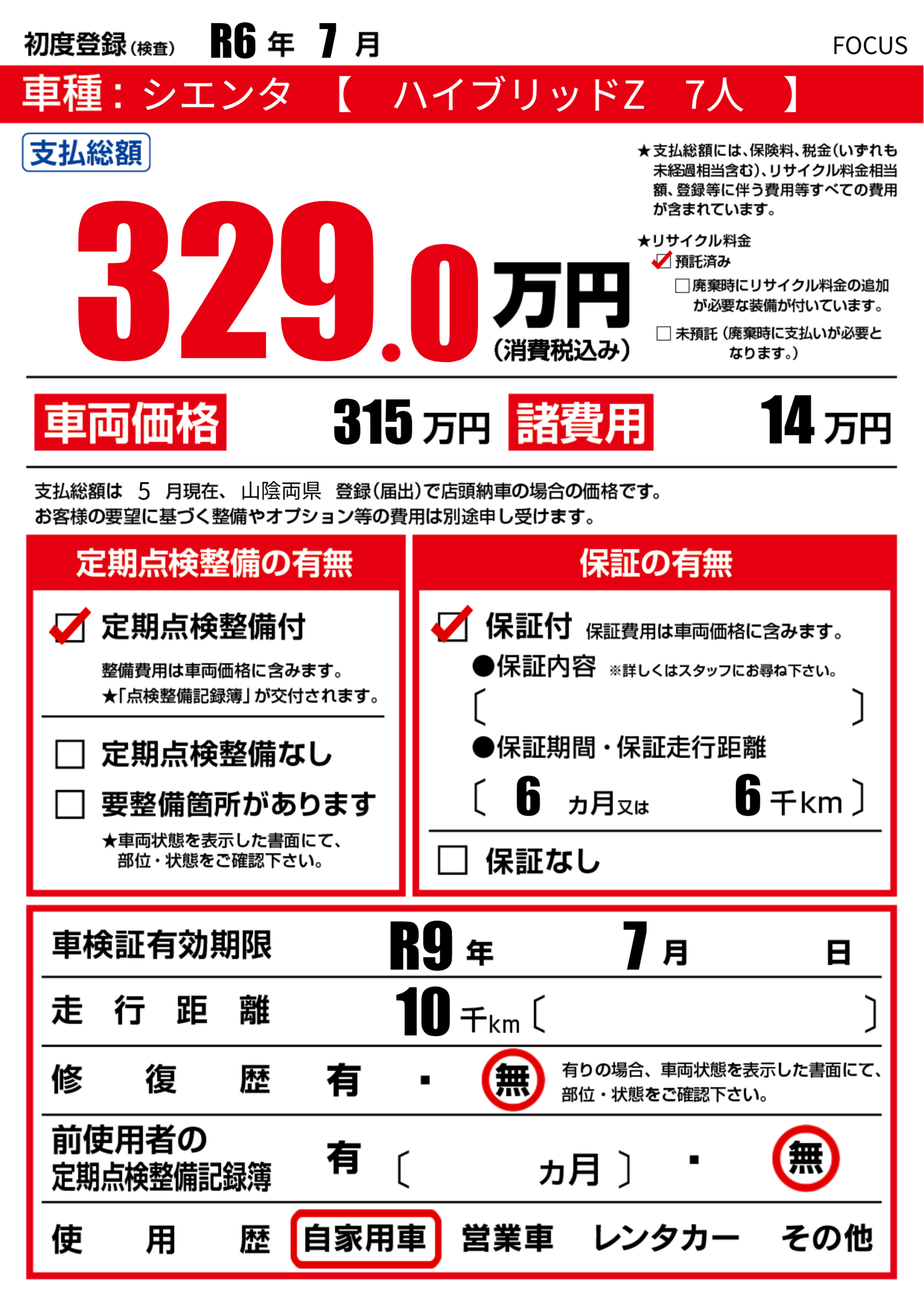 | 走行キロ | 1万km | 初年度登録 | R6年7月 |