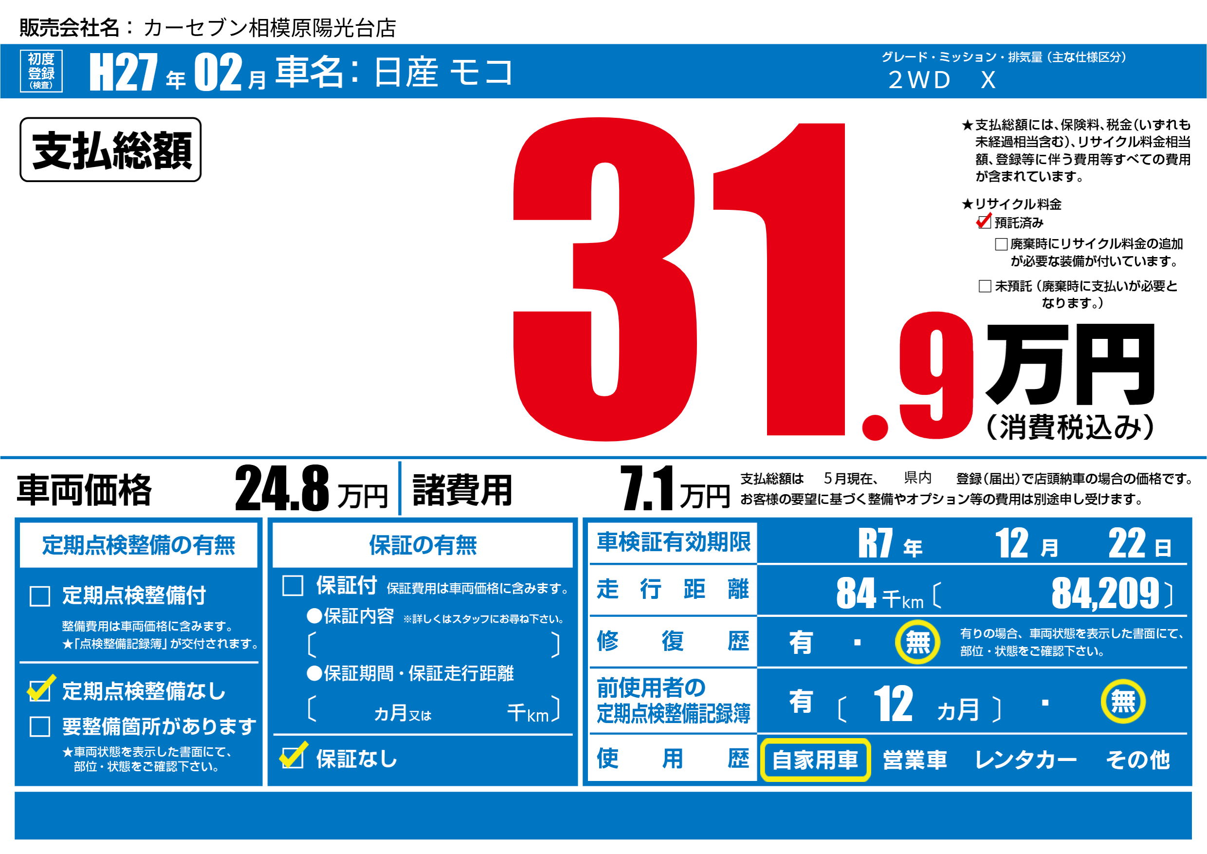 | 車名 | 日産 モコ | グレード ミッション 排気量 |