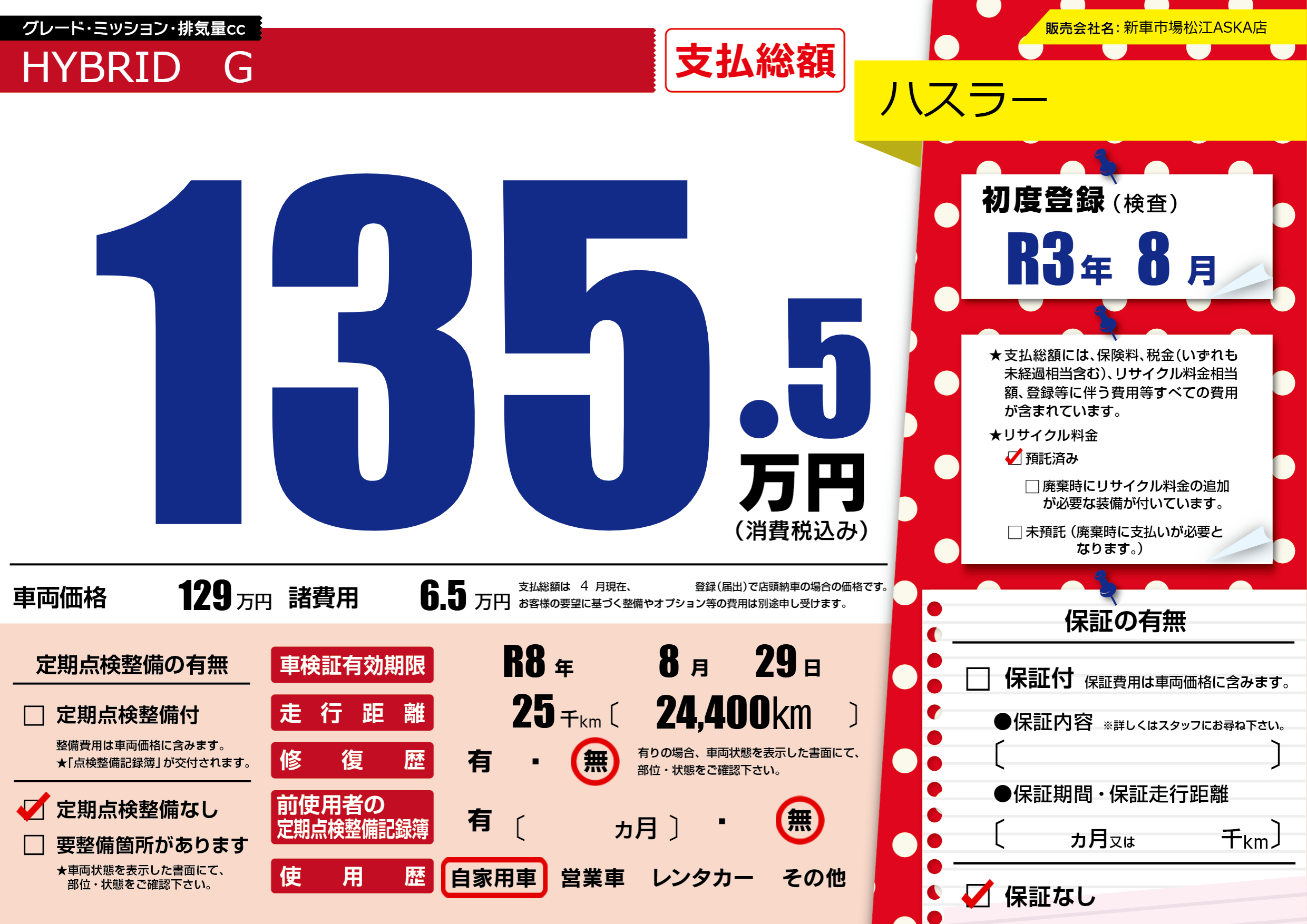 | 車名 | ハスラー | グレード ミッション 排気量 |