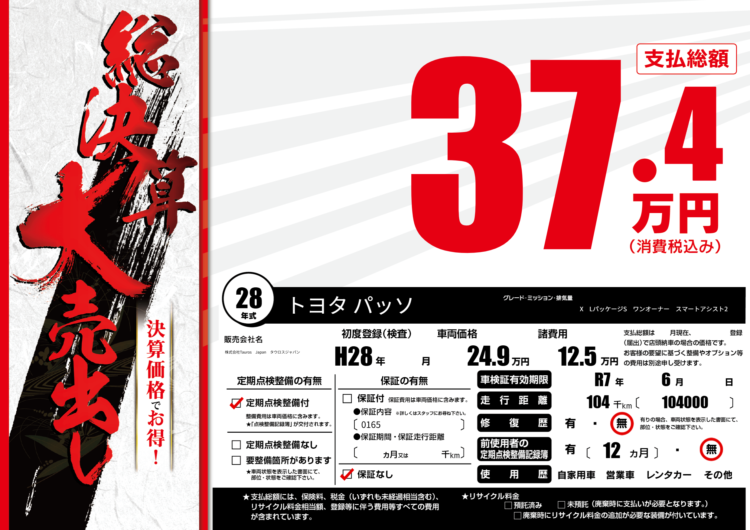 | 車名 | トヨタ パッソ | グレード ミッション 排気量 |