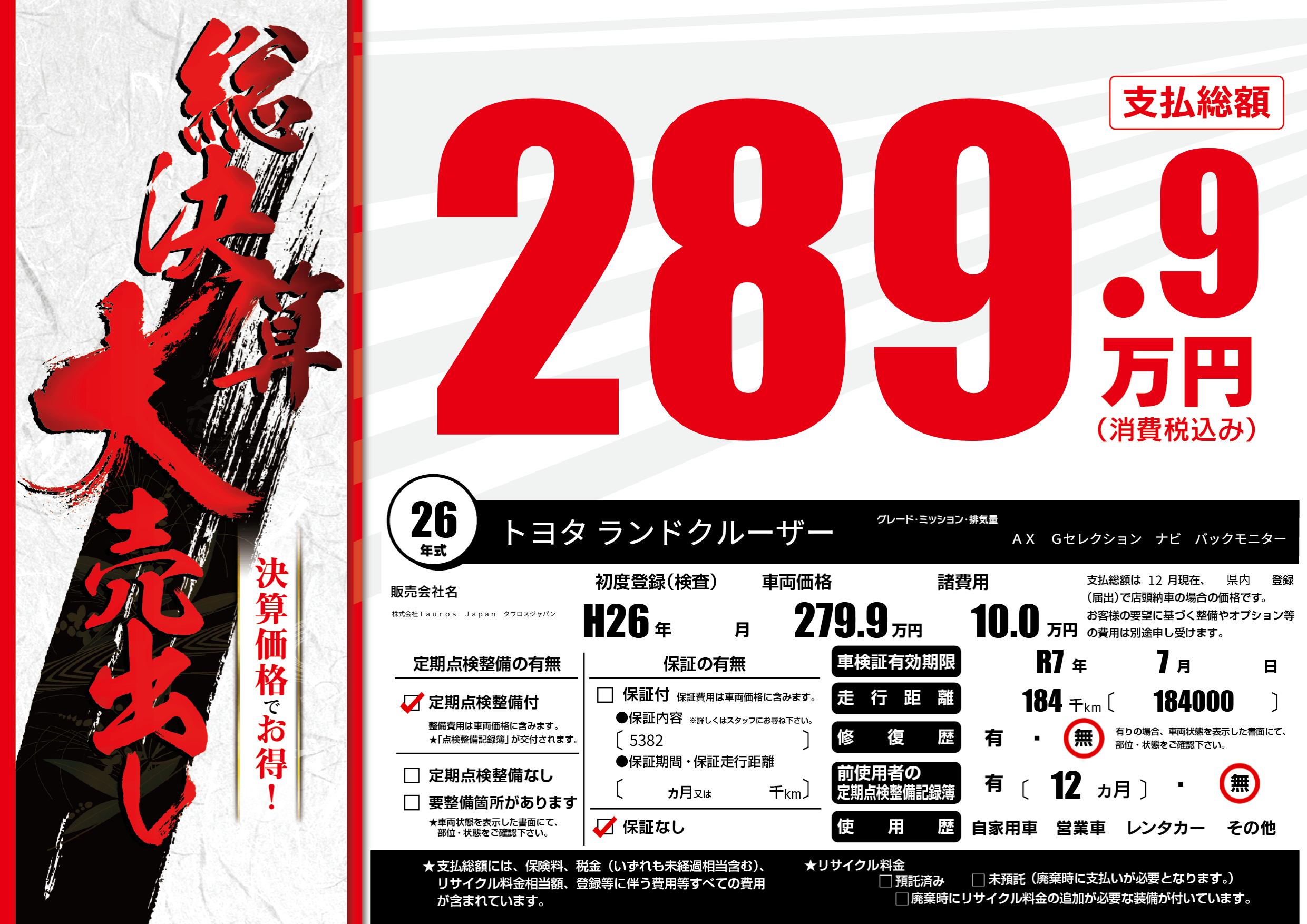 | 車検制限 | R7年 7月 - 日 | ||