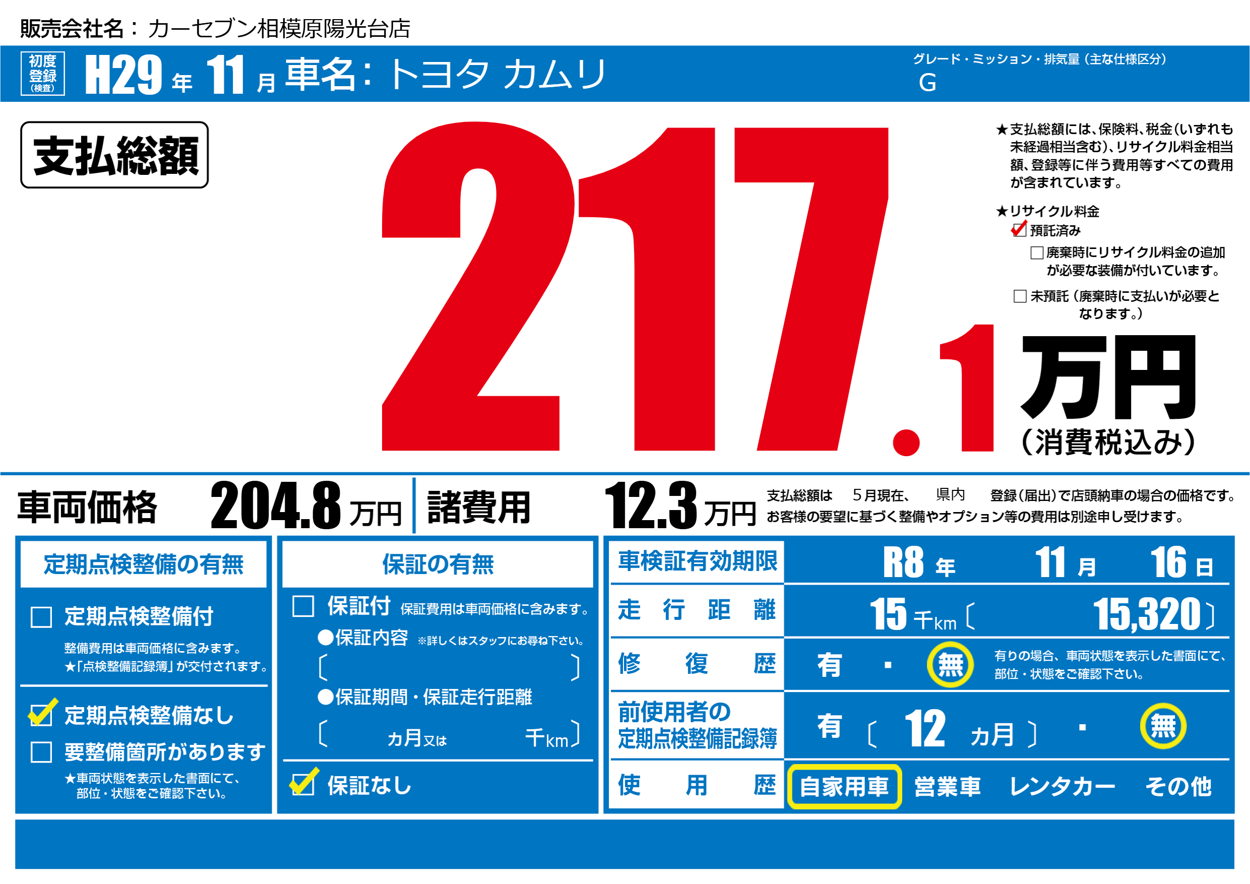 | 車名 | トヨタ カムリ | グレード ミッション 排気量 |
