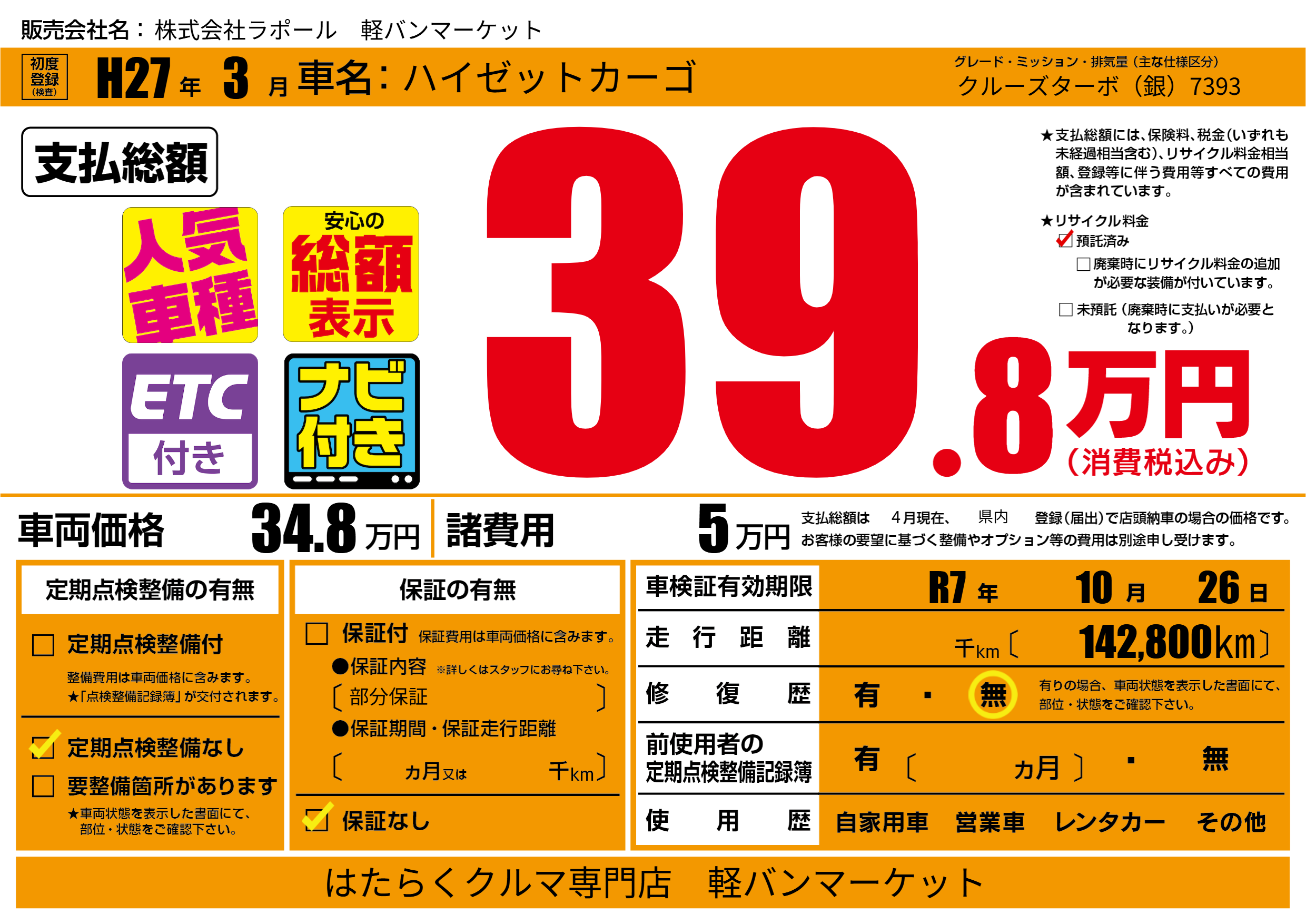 なし | 車検制限 | R7年10月26月 |