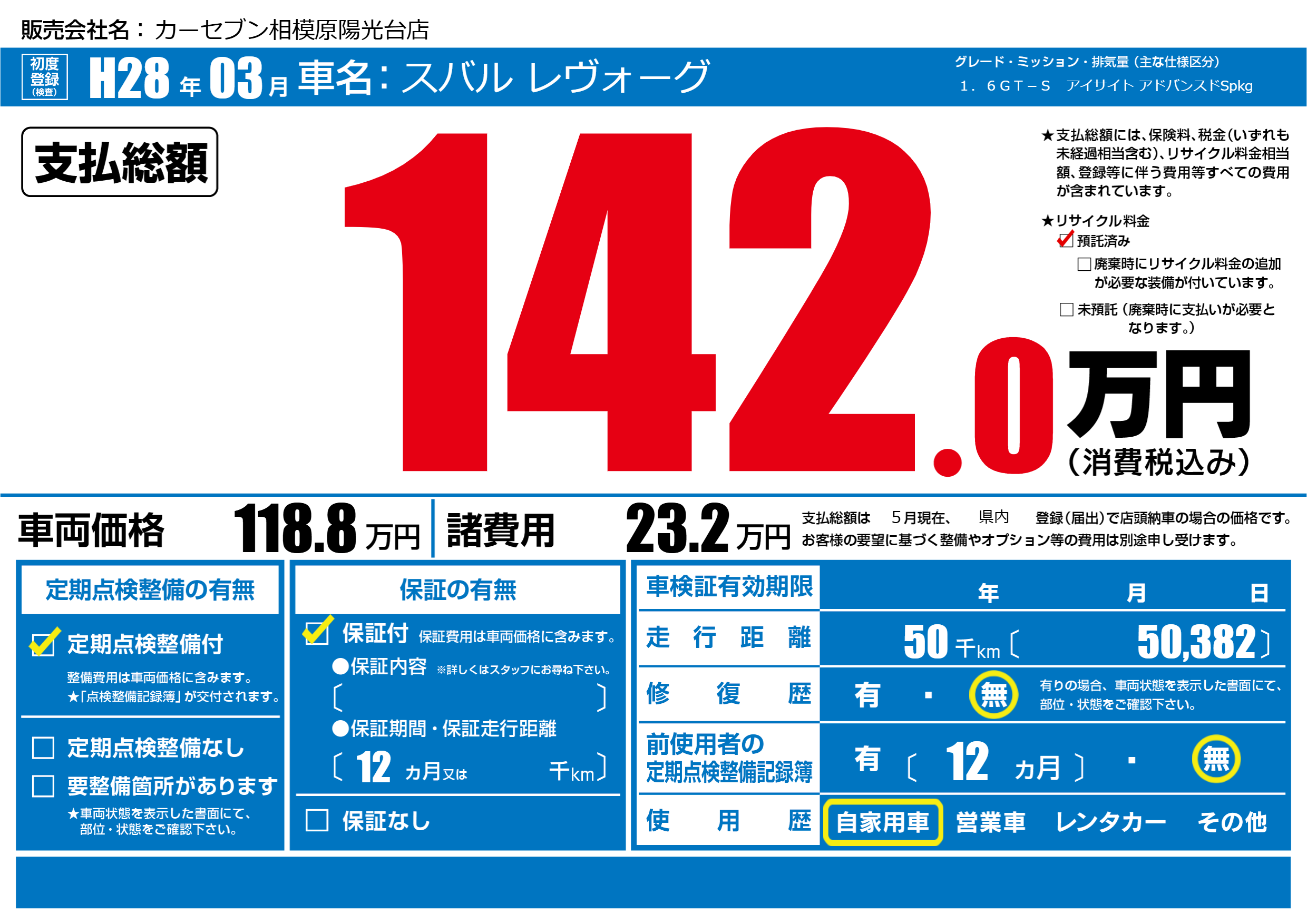 | 車名 | スバル レヴォーグ | グレード ミッション 排気量 |