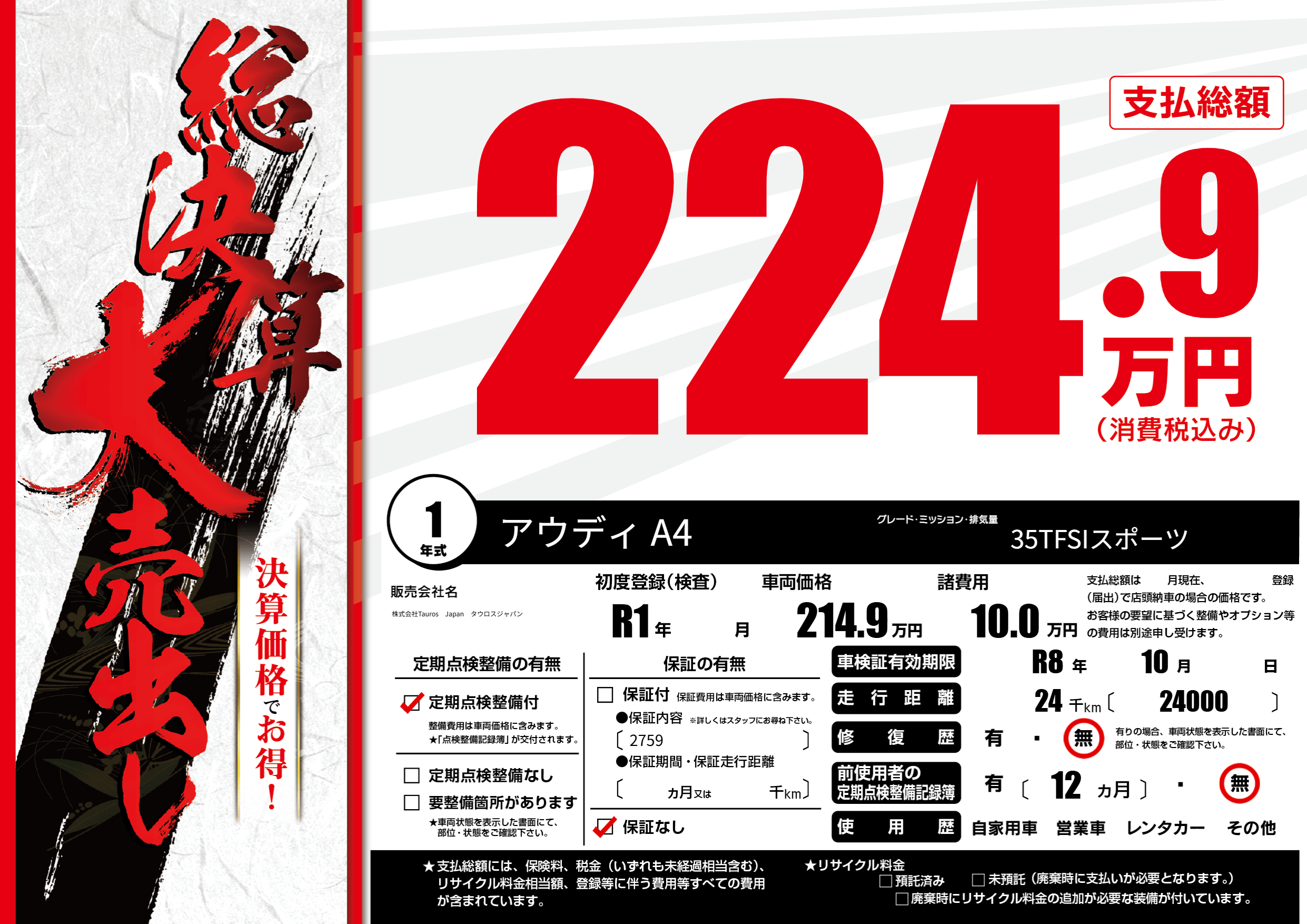 | 車名 | アウディ A4 | グレード ミッション 排気量 |