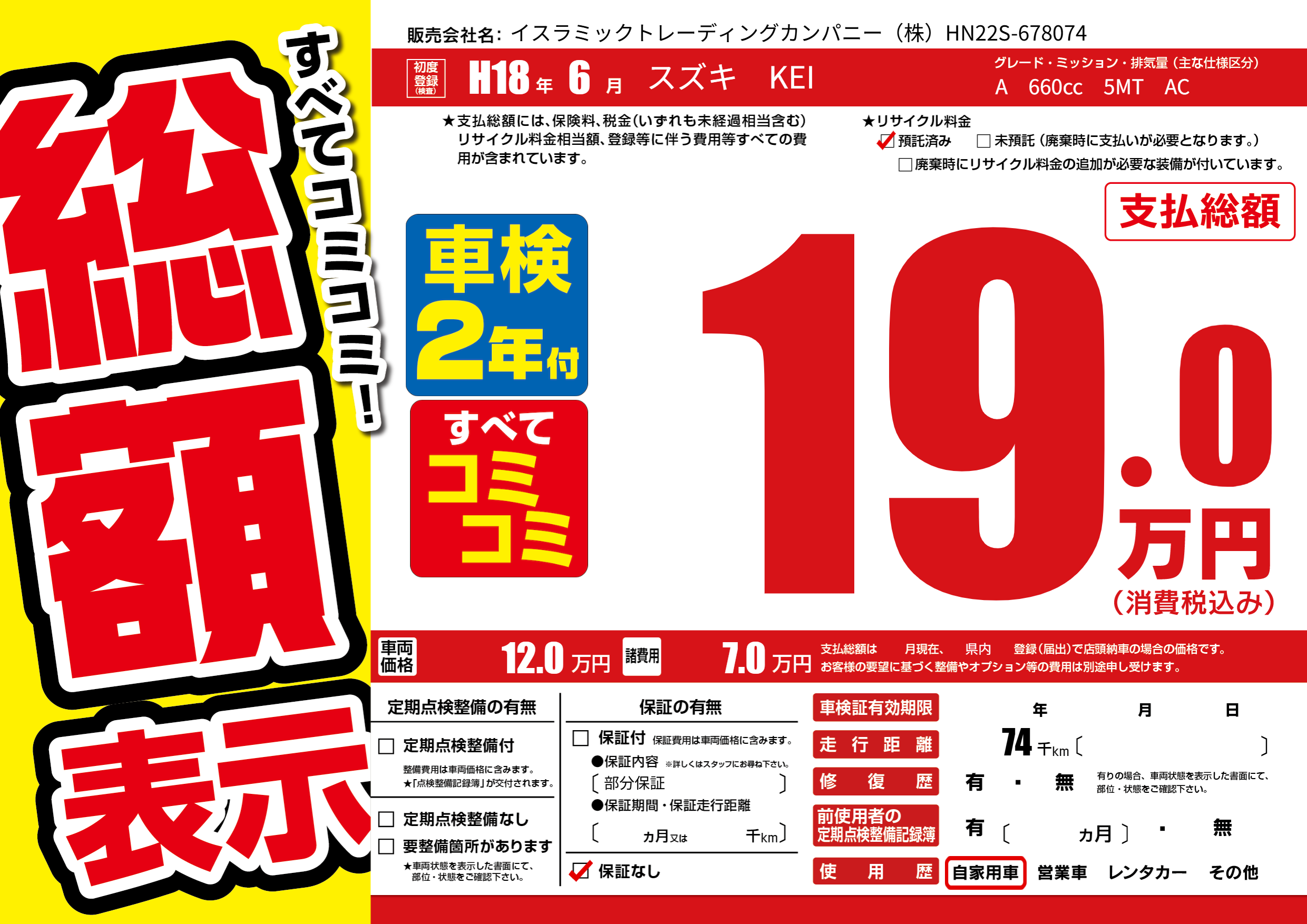 | 車名 | スズキ KEI | グレード ミッション 排気量 |