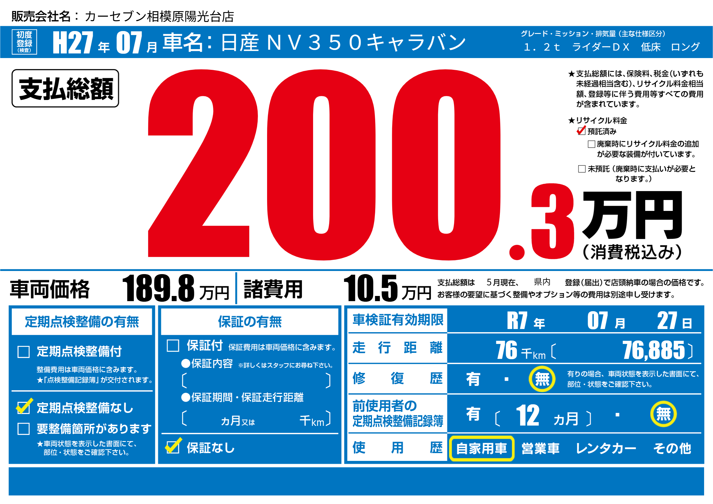 | 車検制限 | R7年 07月 27日 | ||