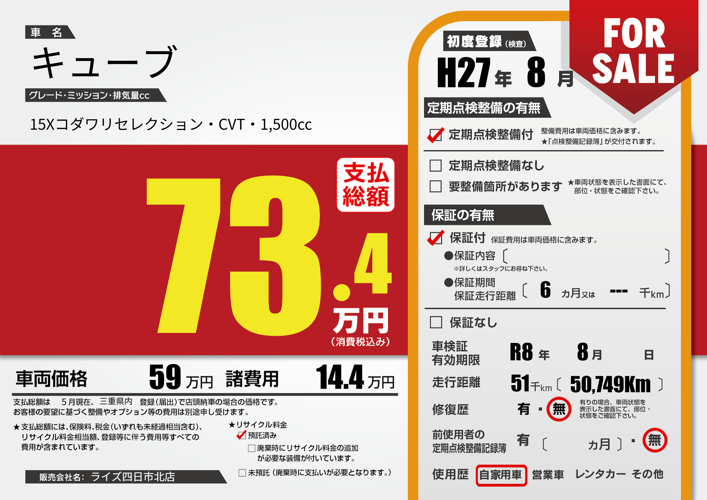 | 車名 | キューブ | グレード ミッション 排気量 |