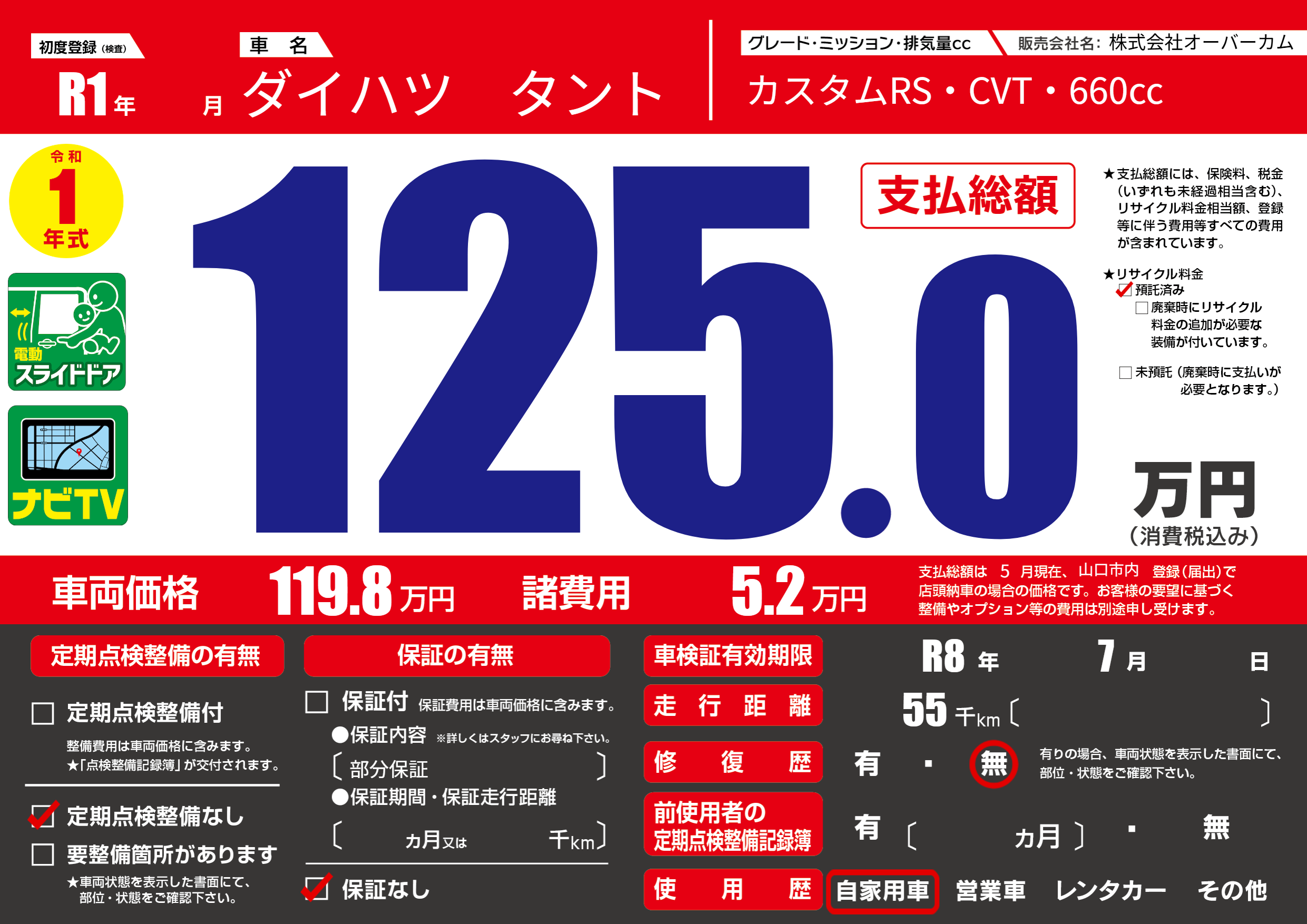 | 走行キロ | 5.5万km | 初年度登録 | R1年---月 |