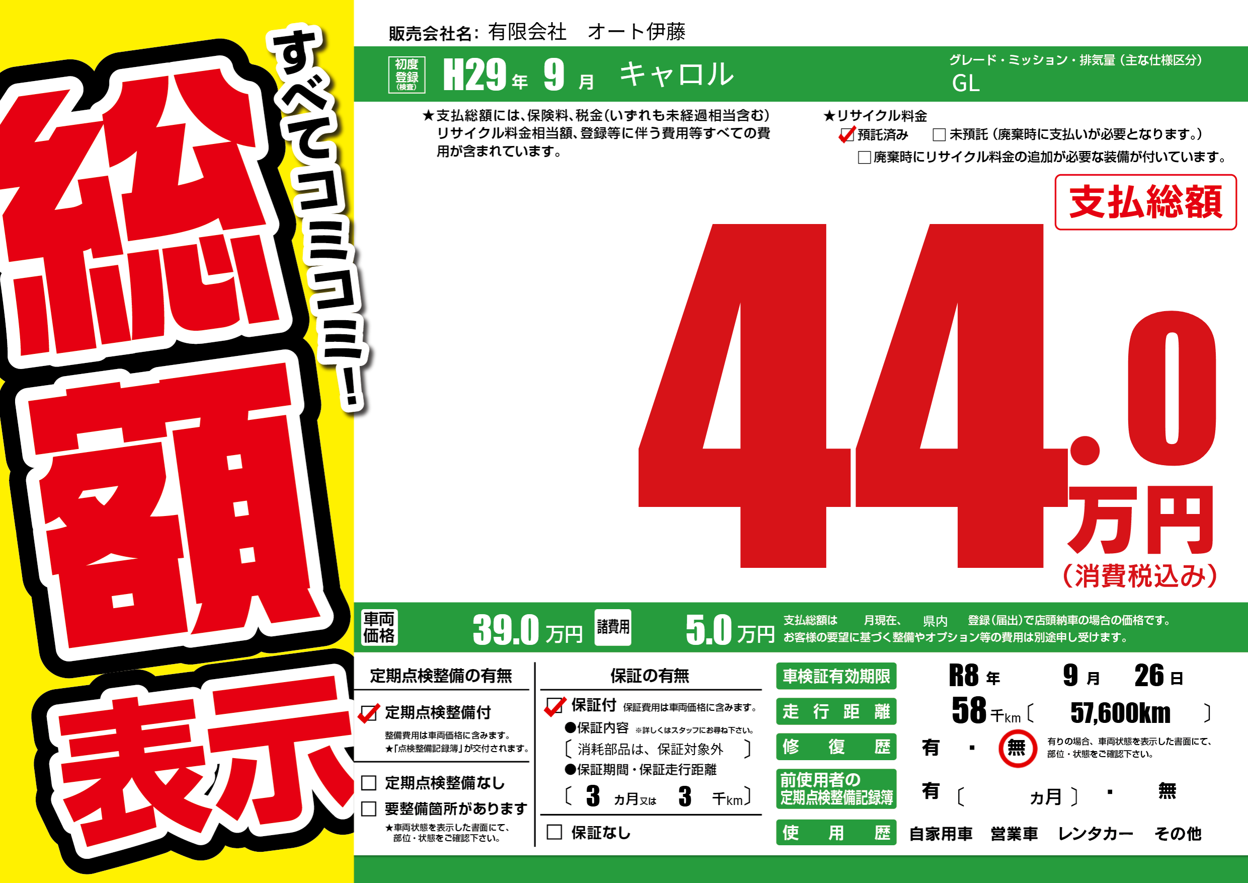 | 車名 | キャロル | グレード ミッション 排気量 |