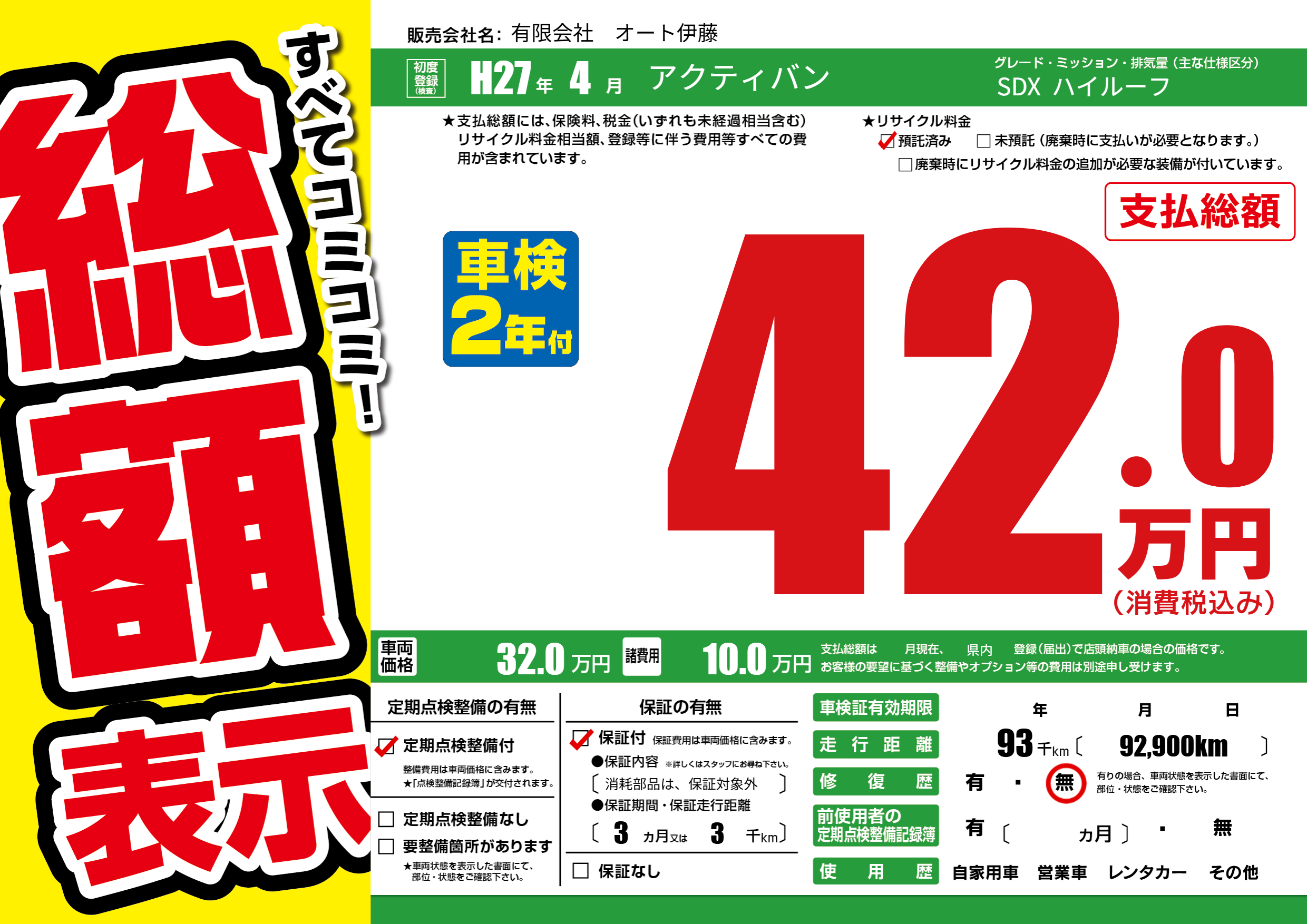 | 車名 | アクティバン | グレード ミッション 排気量 |