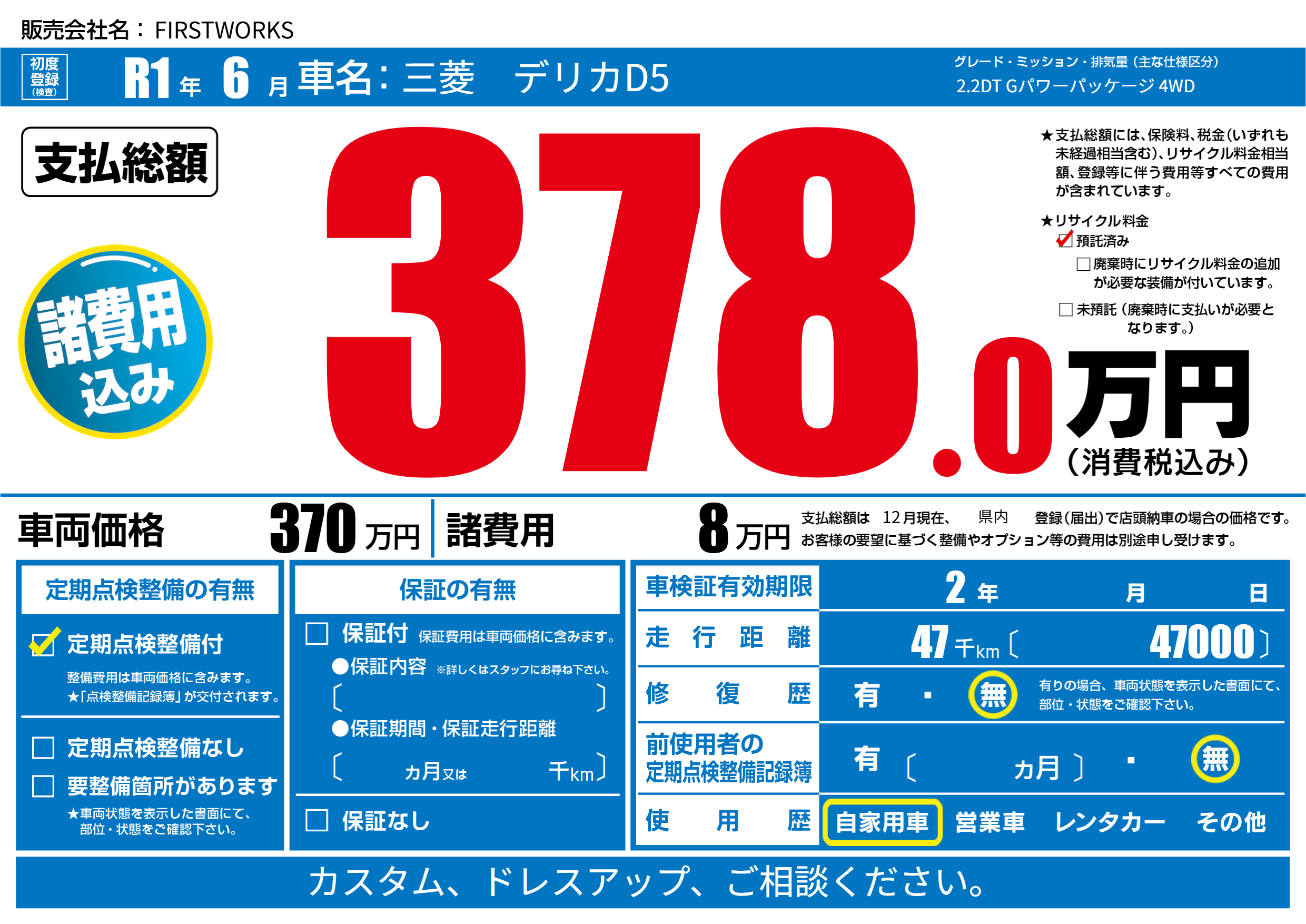 | 車名 | 三菱 デリカD5 | グレード ミッション 排気量 |