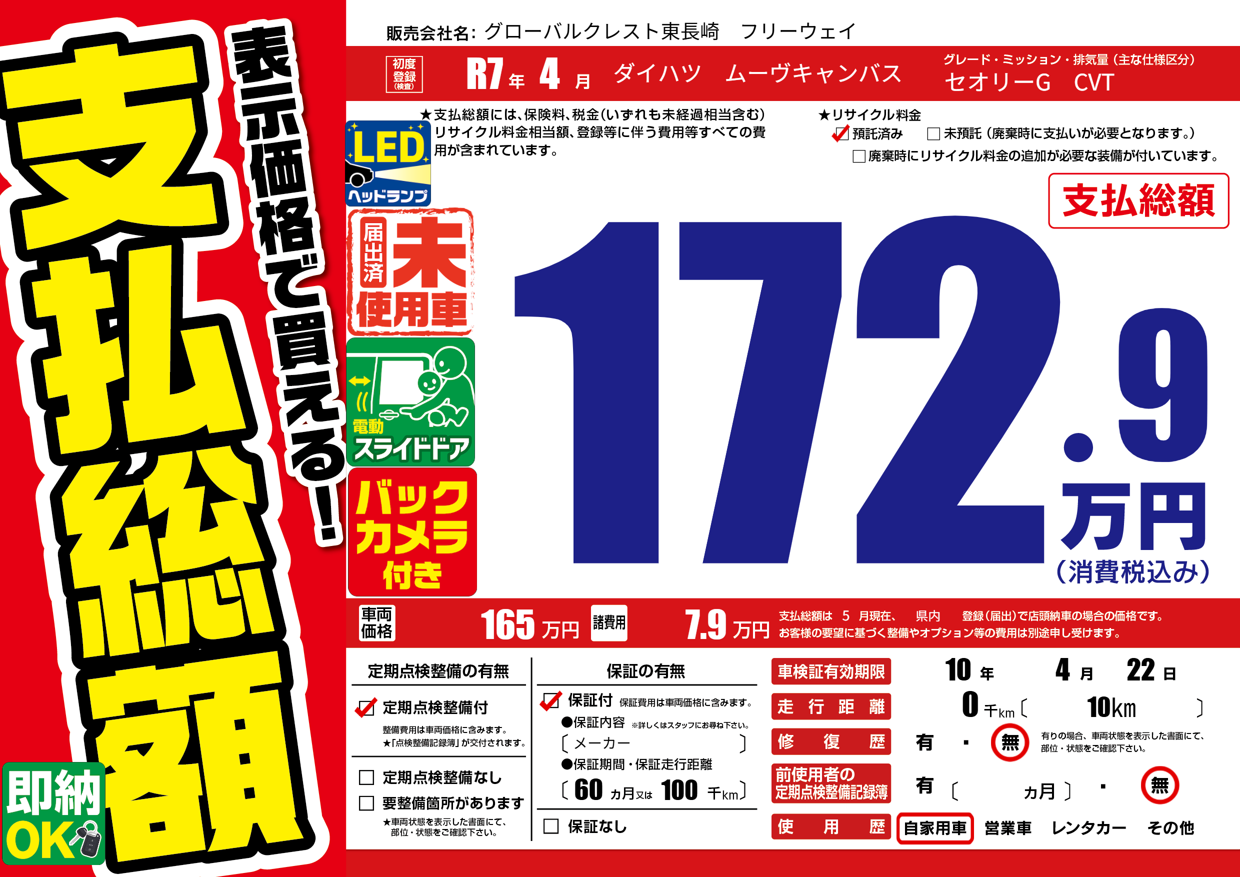 | 走行キロ | - | 初年度登録 | R7年4月 |