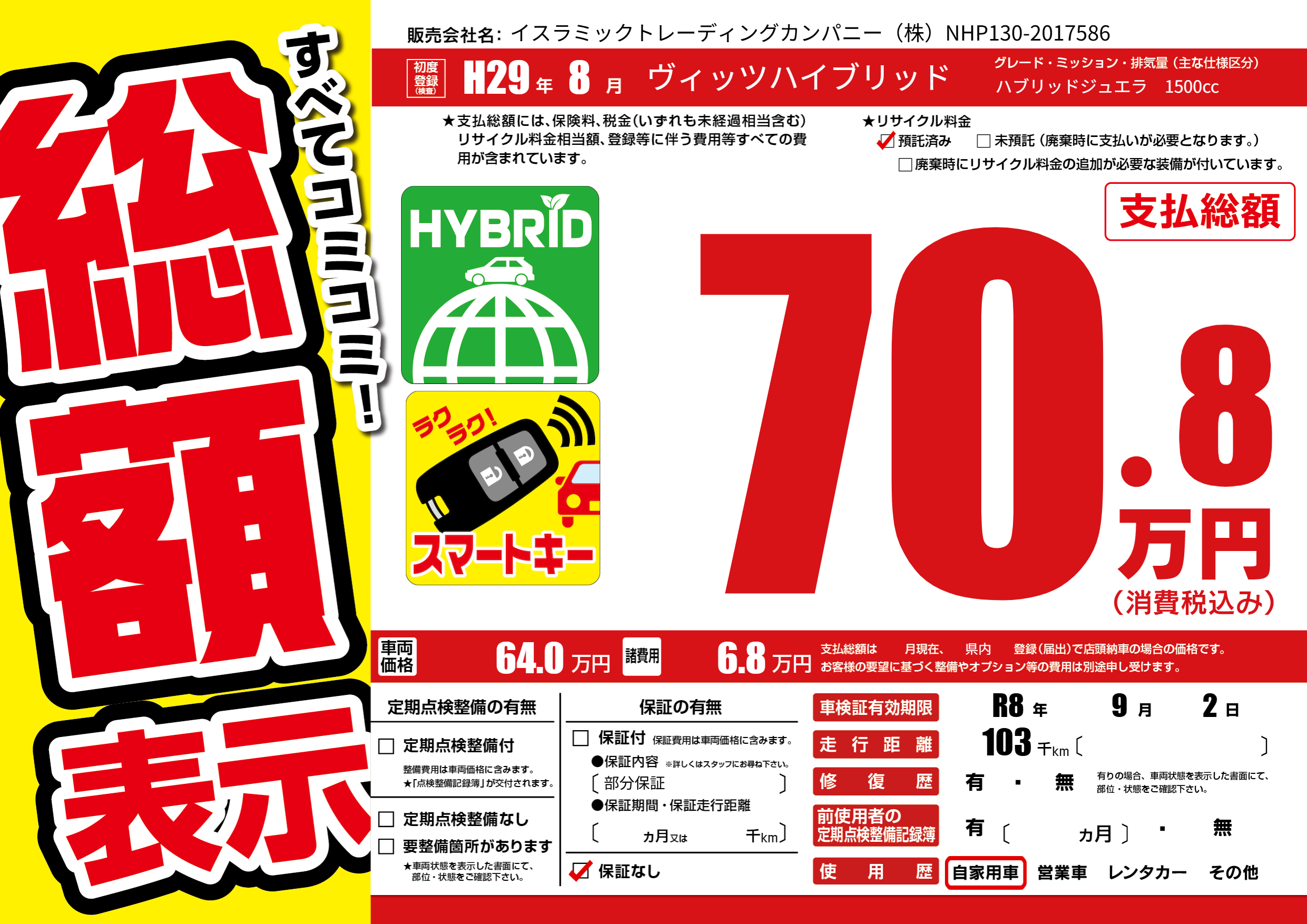 | 車名 | ヴィッツハイブリッド | グレード ミッション 排気量 |