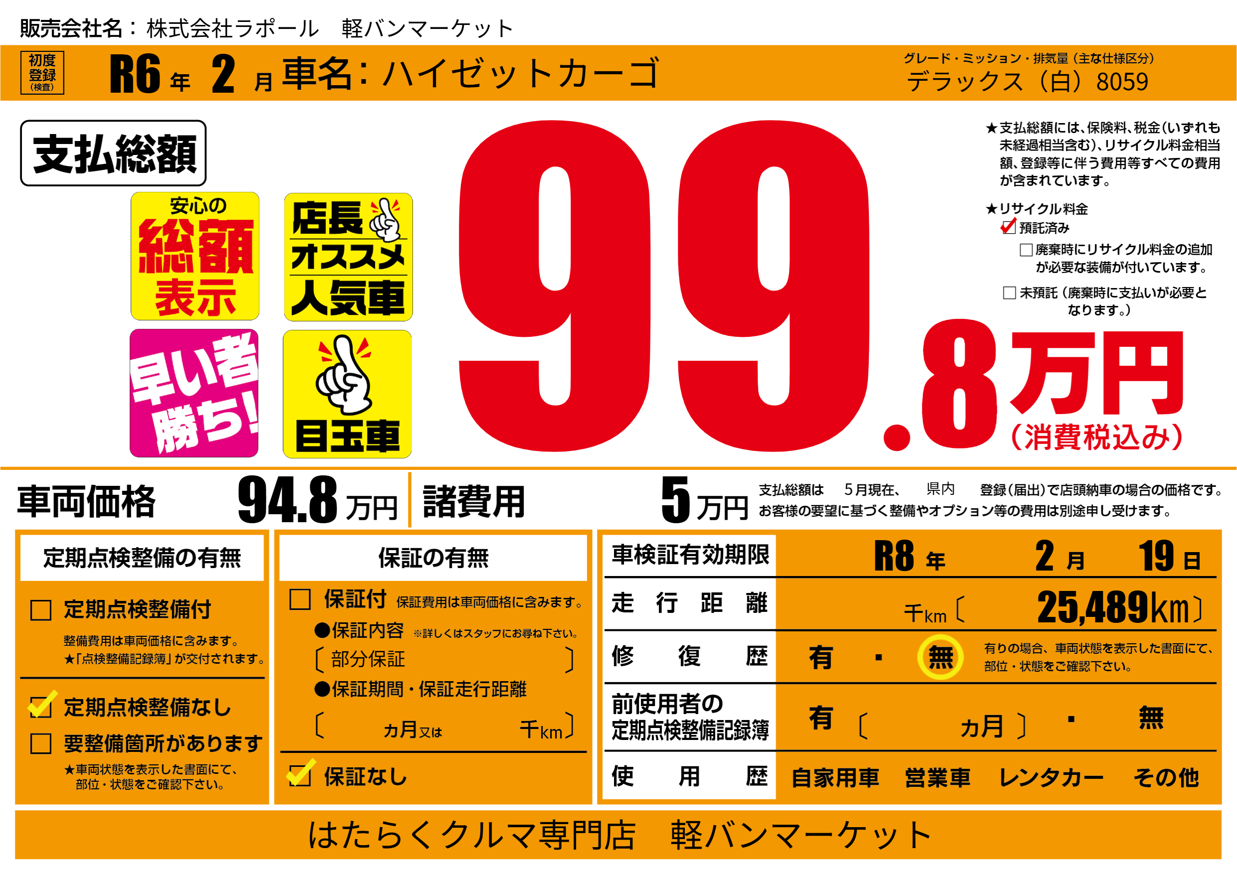 | 車名 | ハイゼットカーゴ | グレード ミッション 排気量 |