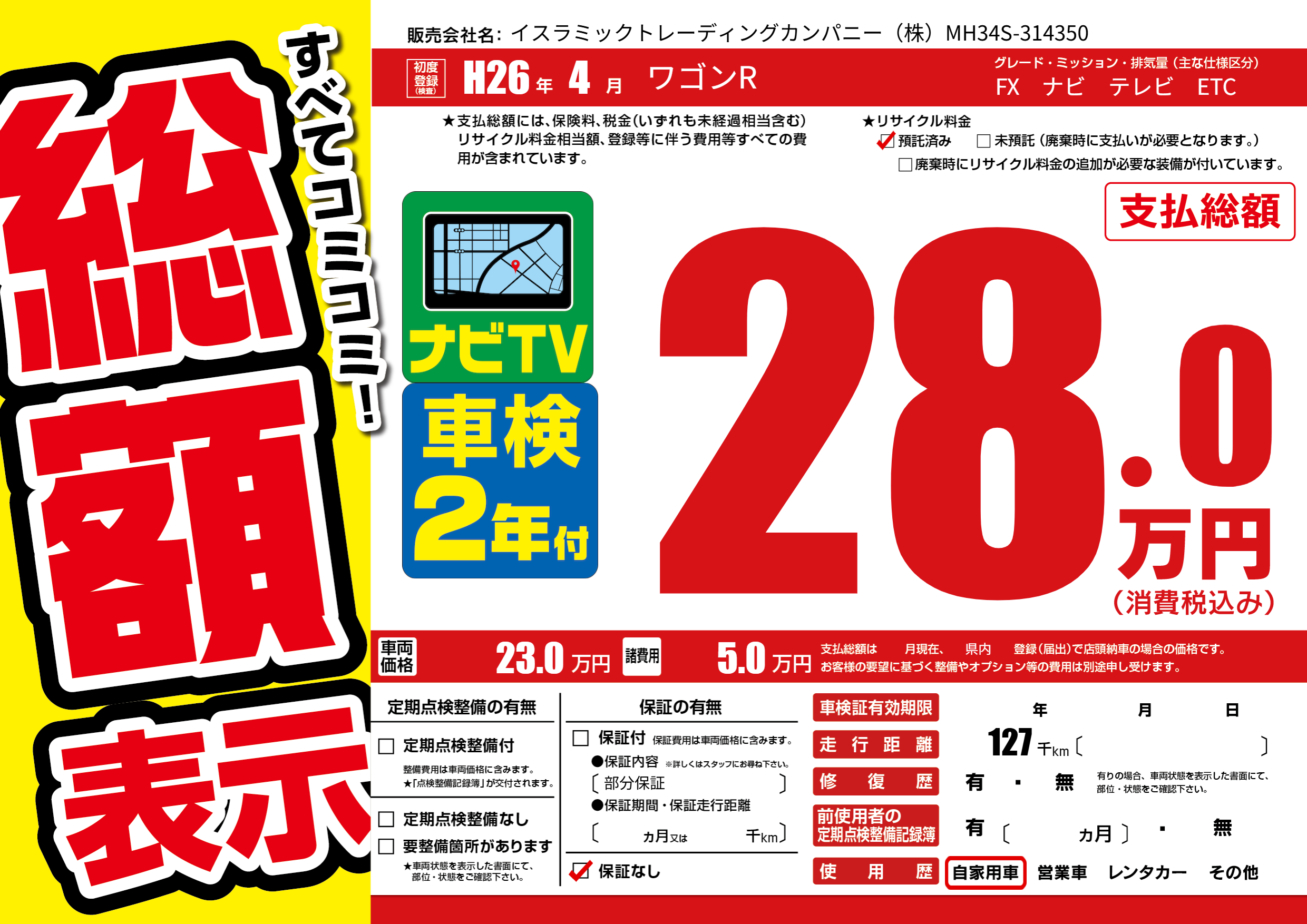 | 走行キロ | 12.7万km | 初年度登録 | H26年4月 |
