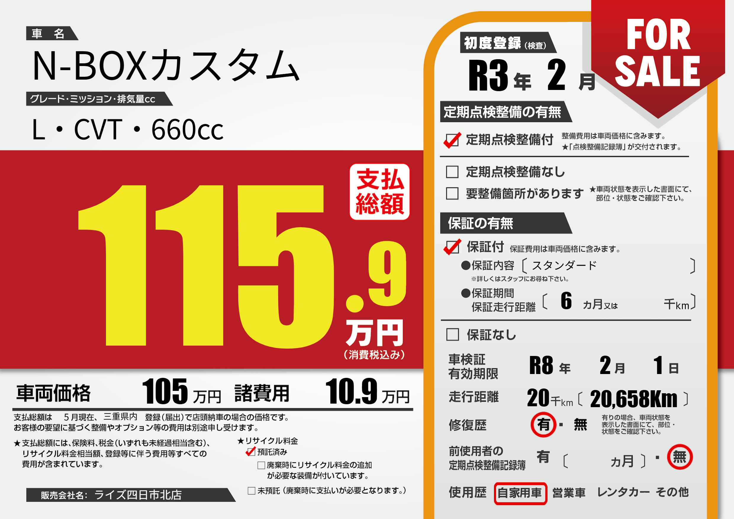 | 走行キロ | 2万km | 初年度登録 | R3年2月 |