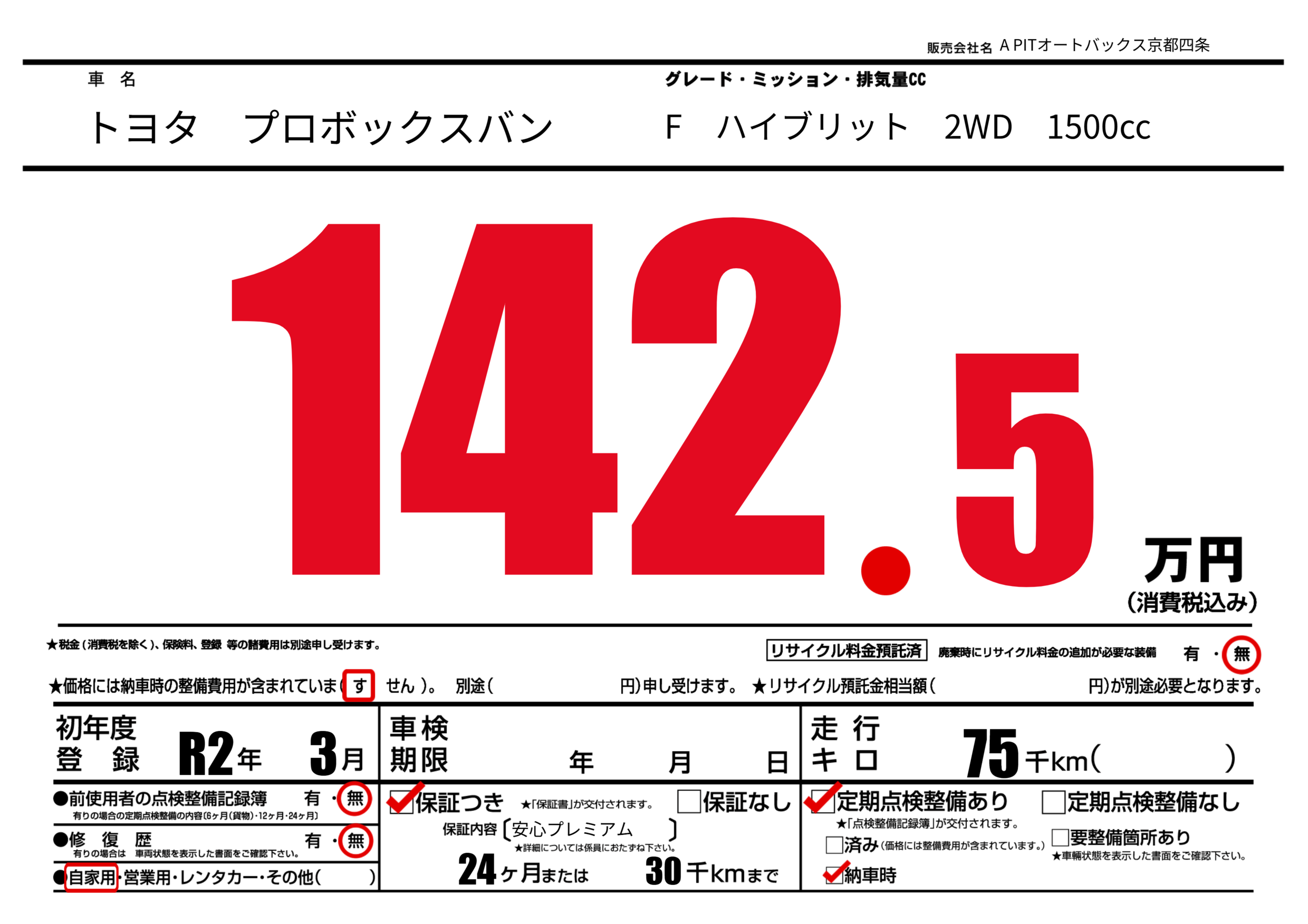 | 車名 | トヨタ プロボックスバン | グレード ミッション 排気量 |