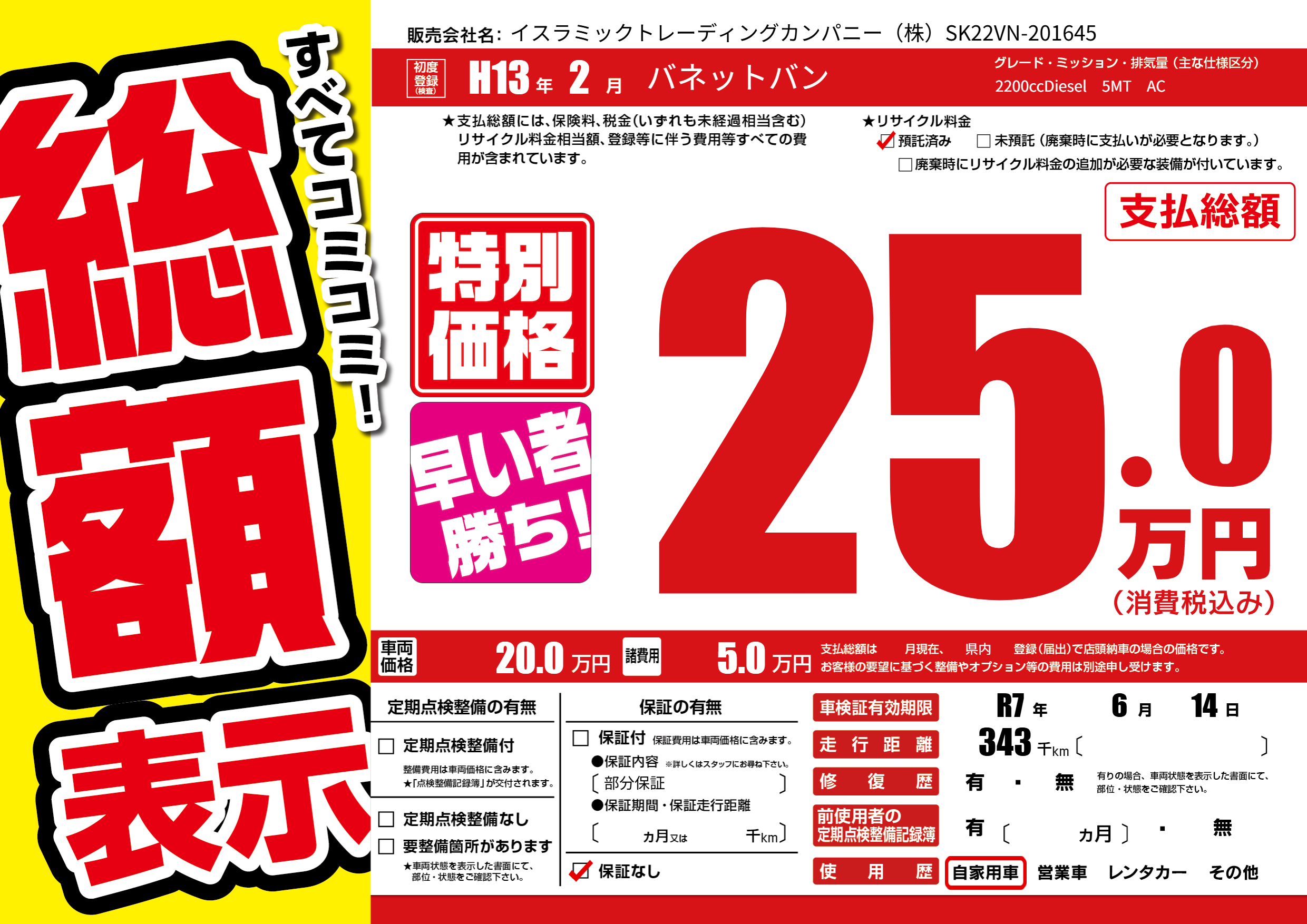 | 車名 | バネットバン | グレード ミッション 排気量 |