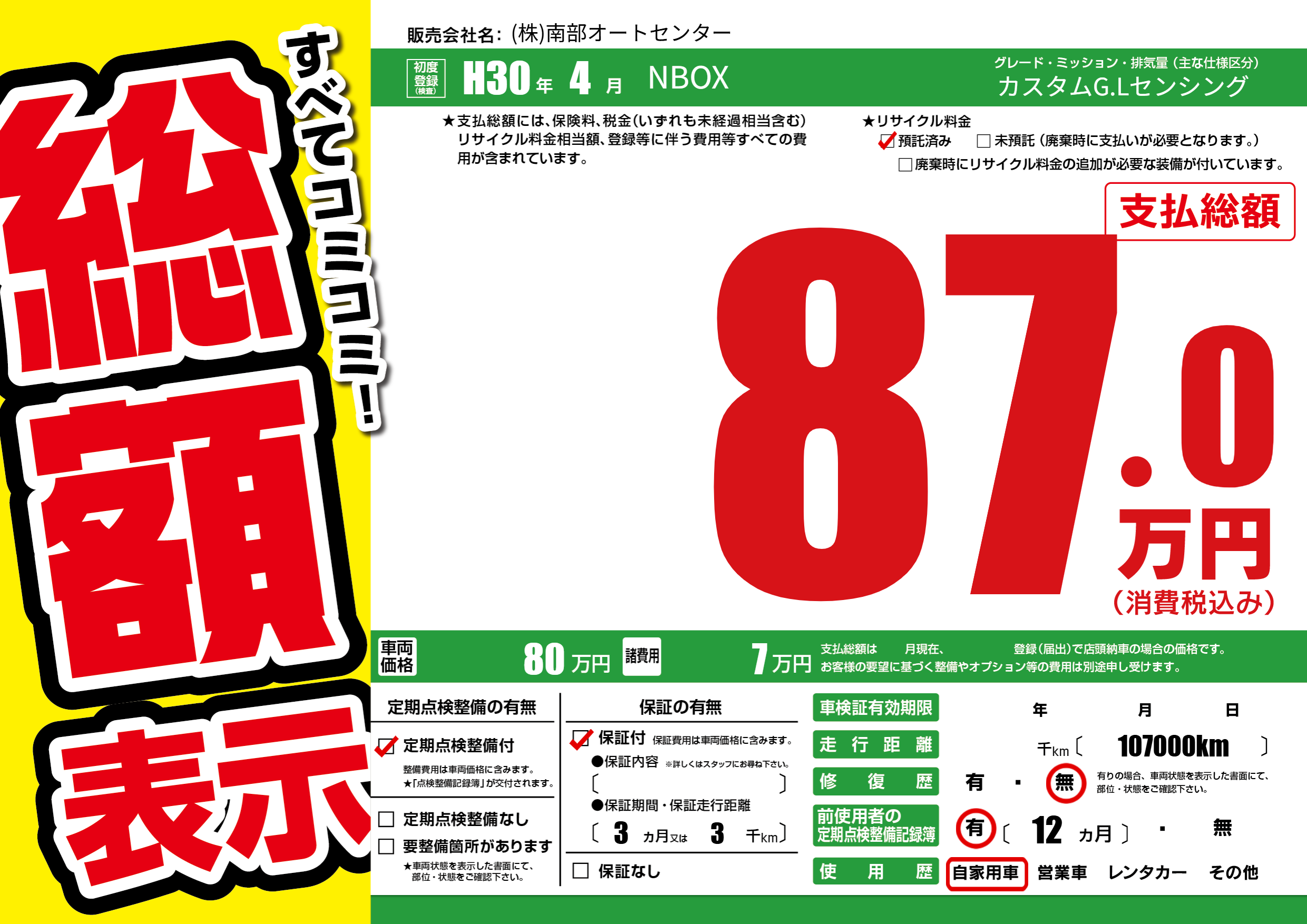 | 車名 | NBOX | グレード ミッション 排気量 |