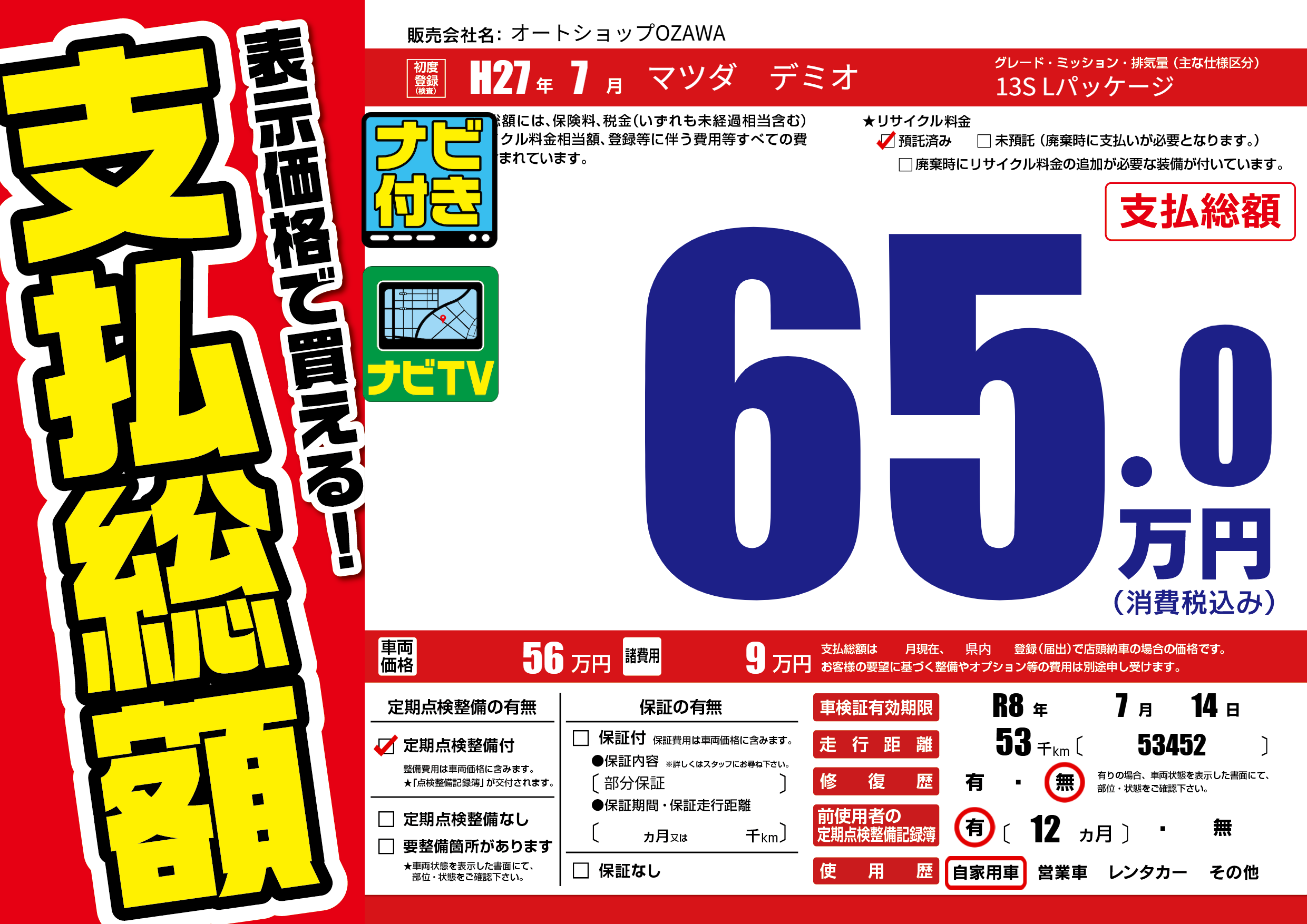 | 車名 | マツダ デミオ | グレード ミッション 排気量 |