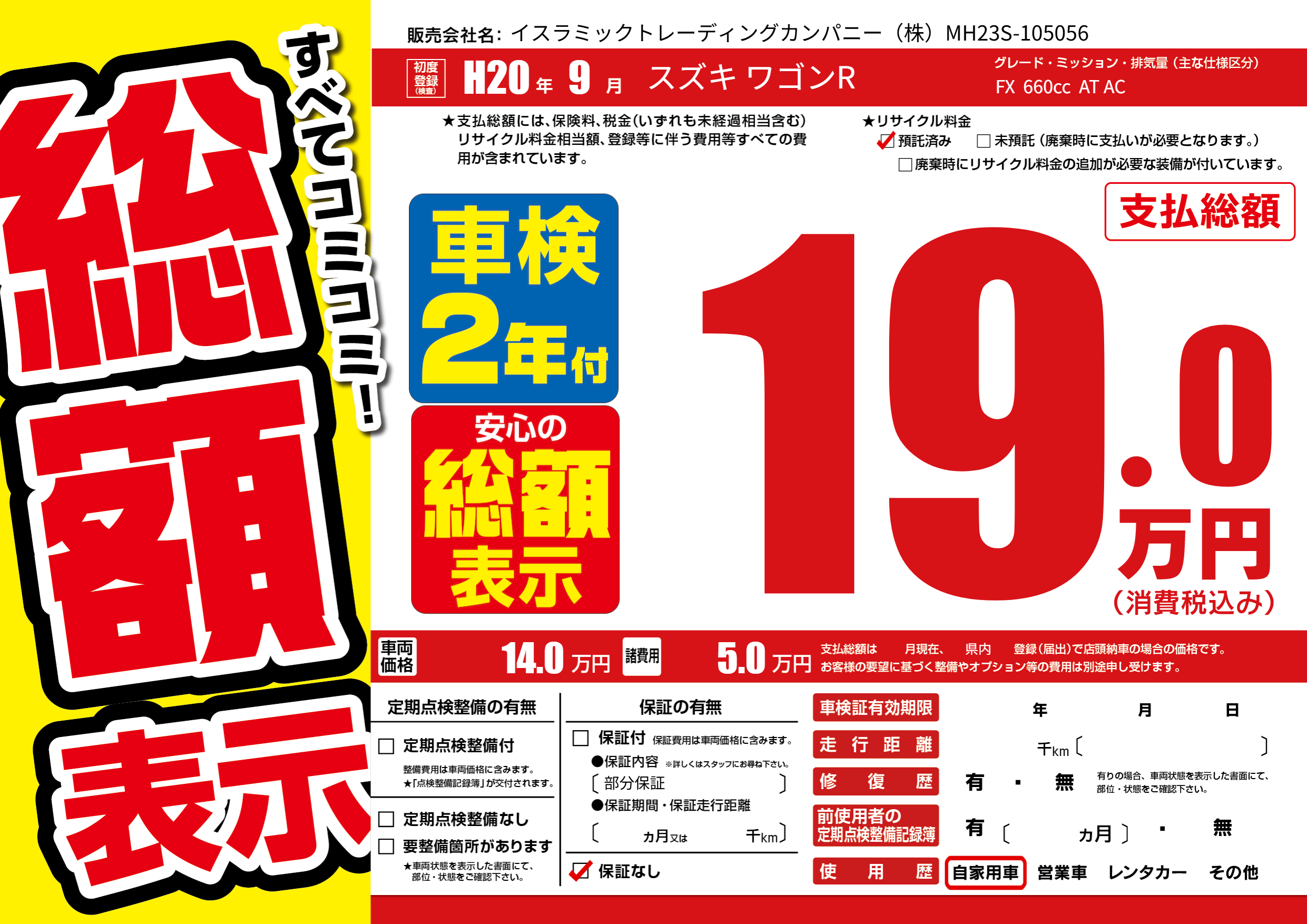 | 車名 | スズキ ワゴンR | グレード ミッション 排気量 |