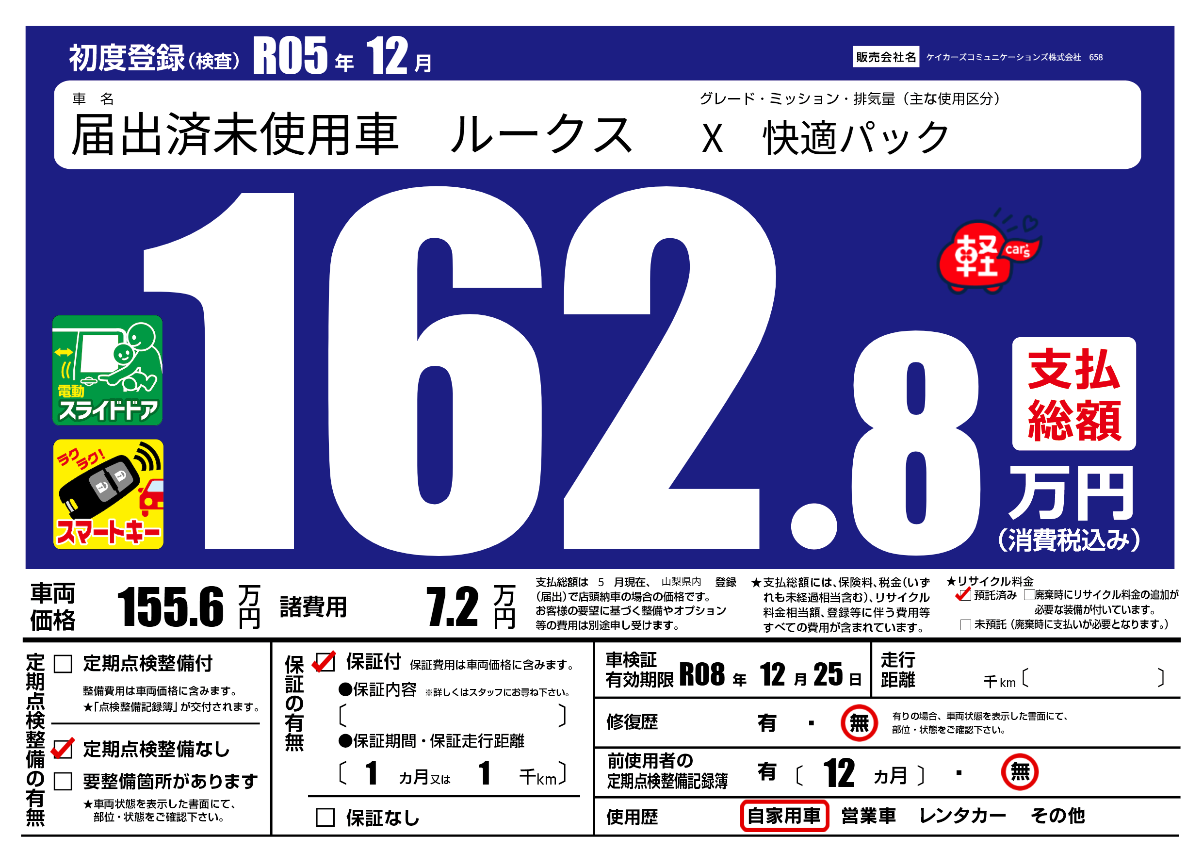 | 走行キロ | - | 初年度登録 | R05年12月 |